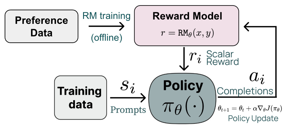 The third step of this process usually happens in an online fashion, meaning that we are generating completions from our policy to be scored by the RM during the training process2. Online RL training is difficult to setup and orchestrate efficiently [10].