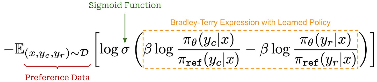 How can we make these two expressions equal? We need to train our learned policy! Specifically, we can formulate a ranking loss that optimizes our learned policy to empirically maximize the probability of chosen responses being preferred to rejected responses based on our implicit reward function. By doing this, we ensure that our preference model is accurate and, therefore, matches that of the optimal policy. Besides replacing explicit rewards with implicit rewards, this loss function is the same exact training objective used by standard reward models; see below.