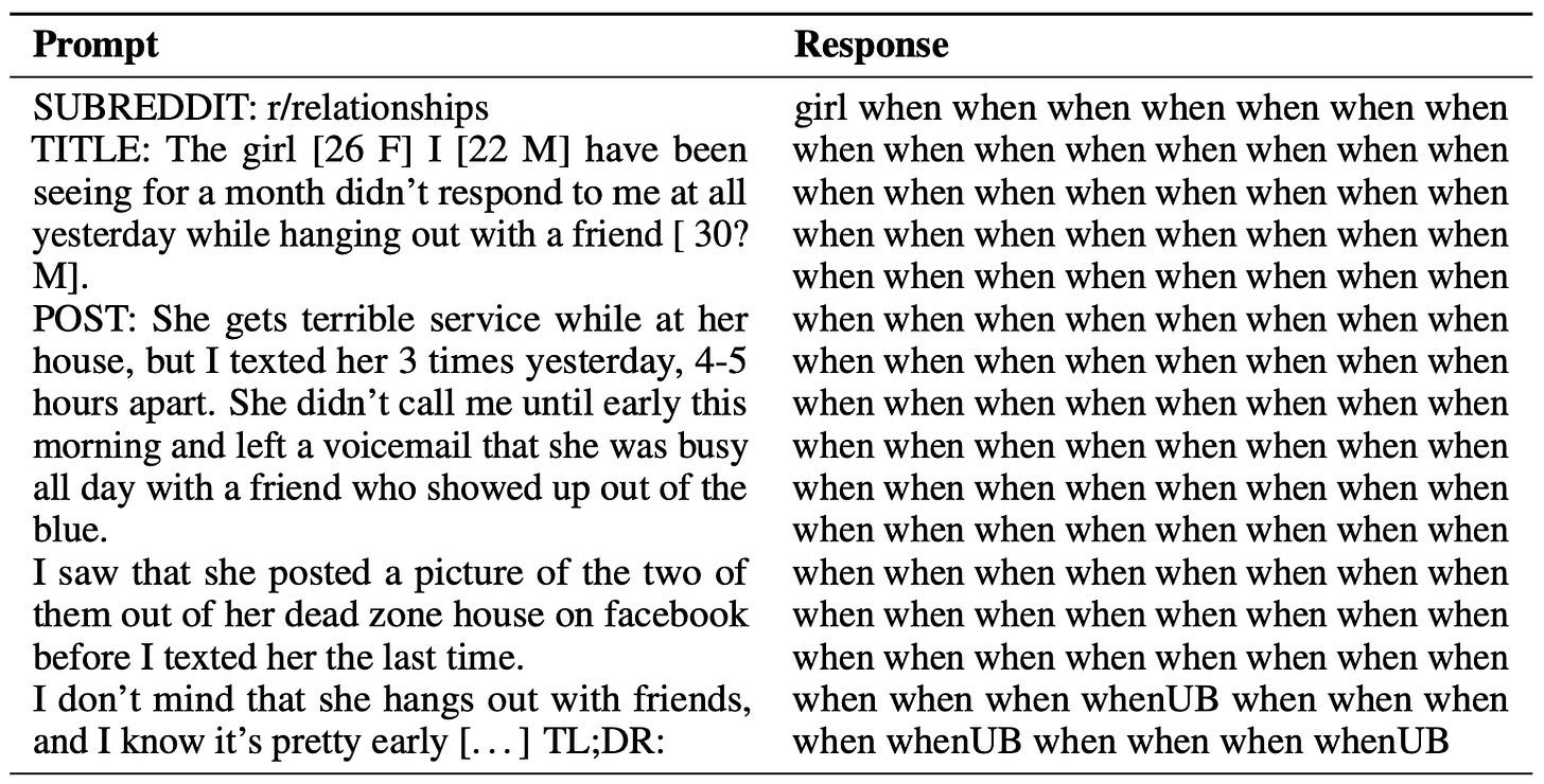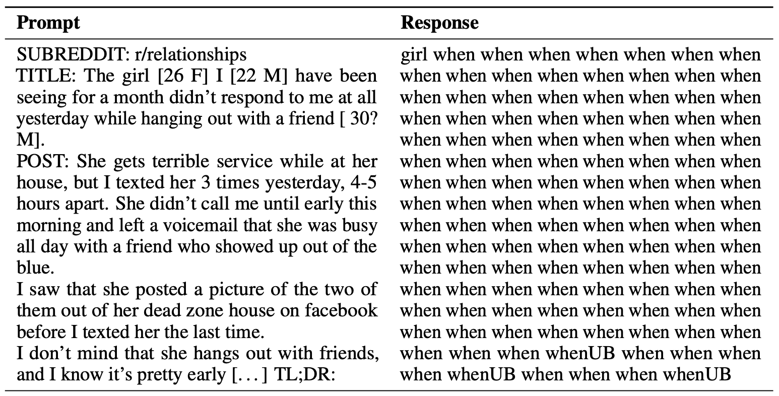 Weighting coefficient. Authors in [1] observe that all three sub-components of DPO’s loss gradient are necessary for the algorithm to work well. Notably, if we remove the first weighting term from this gradient—creating a gradient that uniformly increases the likelihood of all chosen completions and decreases the likelihood of all rejected completions—the resulting policy is low-quality and even tends to completely degenerate when generating text; see below. Such a training algorithm is called unlikelihood training and has been explored in the past [5]. The simple weighting term added to the loss gradient by DPO completely transforms this approach, making it capable of performing high-quality LLM alignment.
