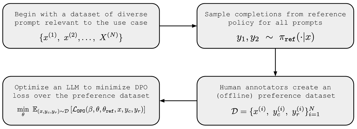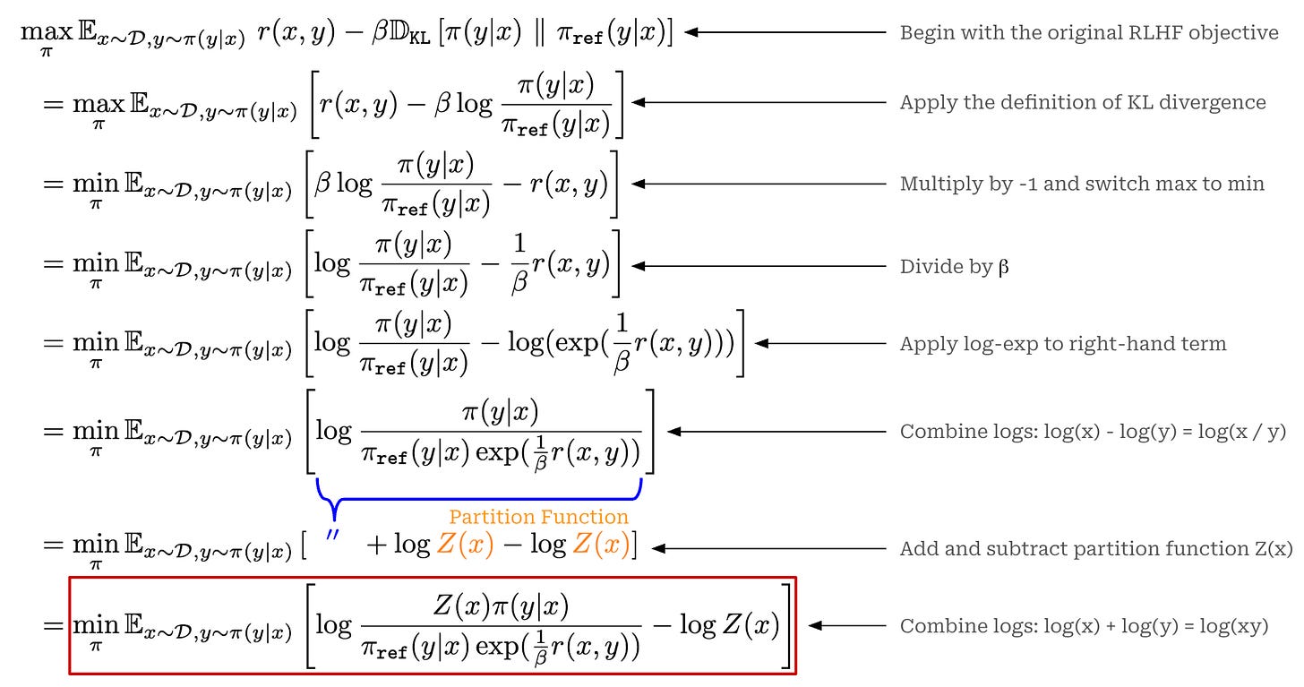 The above steps start with the objective used to train LLMs in RLHF and ends with the DPO loss function. In this derivation, we reformulate the RLHF optimization problem to arrive at the DPO training methodology. As we will see, RLHF and DPO are intricately related—they are trying to solve the same optimization problem! By studying the derivation below, we gain a deeper grasp of the relationship between these techniques.