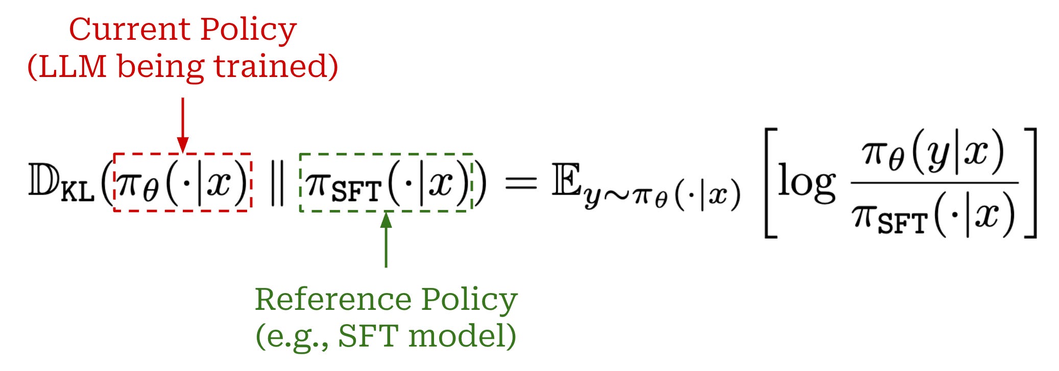 Relation to LLMs. In the LLM domain, KL divergence is commonly used to compare two LLMs or policies. Typically, we will compare the policy that we are currently trying to train to a reference policy. For example, in the case of DPO, we begin with an SFT policy (i.e., an LLM that has already undergone both pretraining and SFT), then optimize the standard RLHF objective, where the KL divergence is computed between this SFT (reference) policy and the policy that we are training. Specifically, the form of this KL divergence would be: