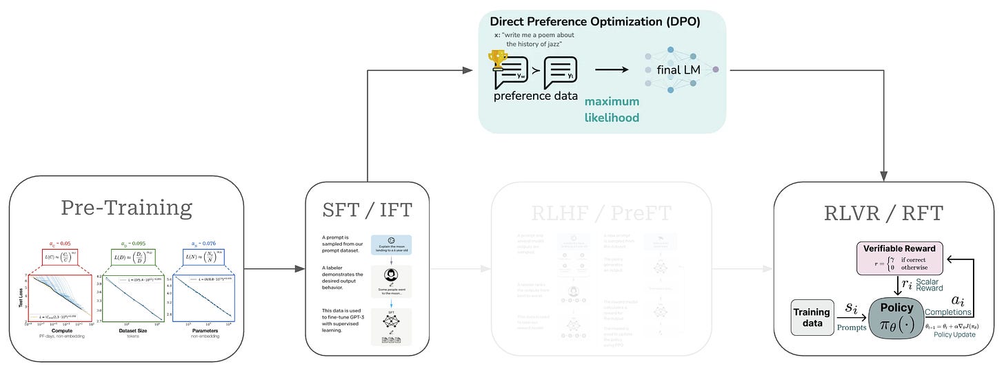 Given that this overview will focus upon DPO, we need to understand where DPO fits into the overall training process for an LLM. This training process, which has (roughly) four parts, is depicted in the figure above. We can break down each of these steps and their corresponding purpose as follows: