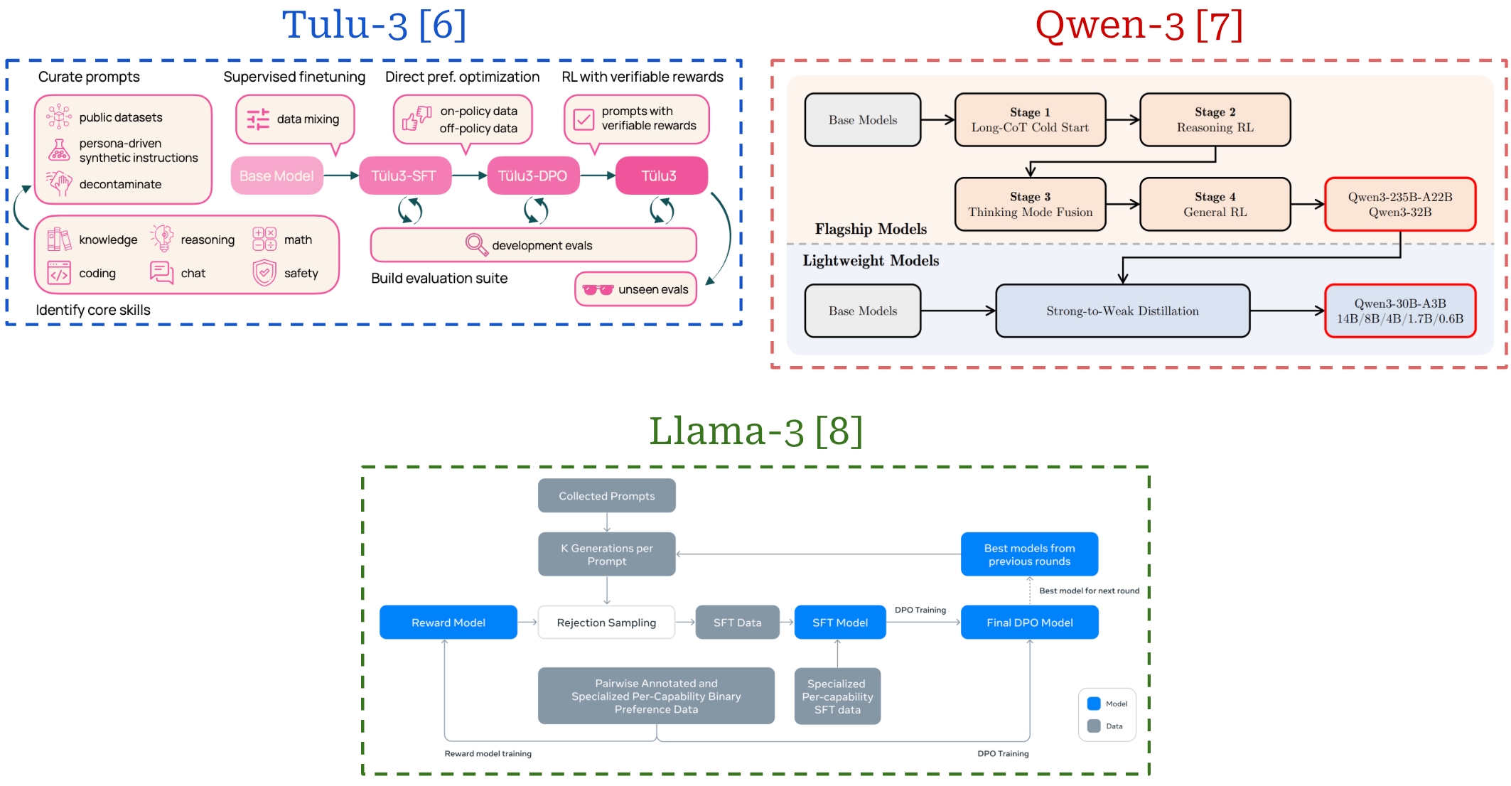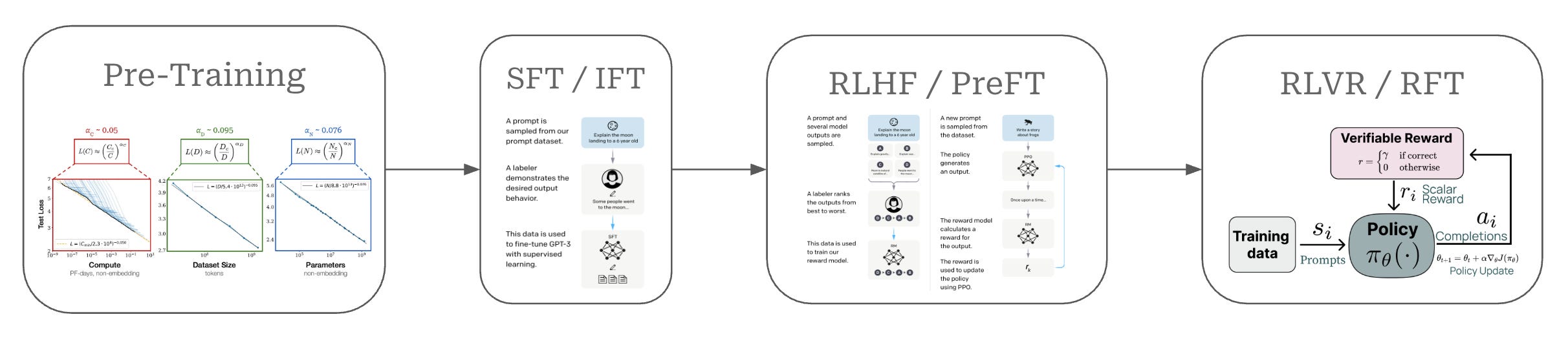 As we can see, each of these training stages play a key purpose in the process of creating a high-quality LLM. These training techniques can be grouped into the broad categories of pretraining and post-training—or everything that comes after pretraining. Pretraining is always the first step of training an LLM, but the post-training process can vary widely depending on the LLM being trained. The same techniques—i.e., SFT, RLHF and RLVR—are usually used, but their exact ordering and setup can change. See the image below for several examples of LLM post-training pipelines that each adopt a slightly different setup.