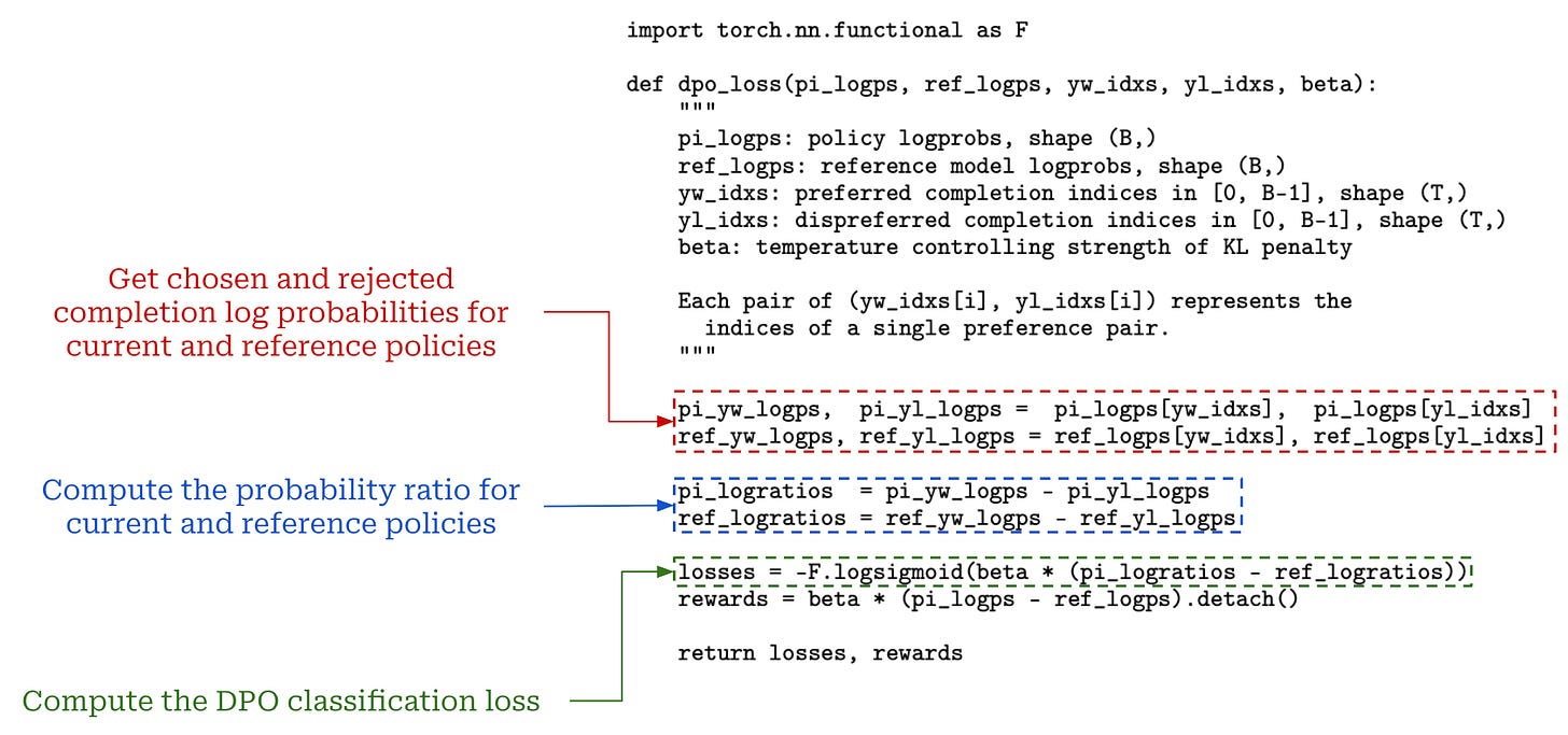 Loss implementation. We can pretty easily implement the loss function for DPO in PyTorch—it is just a ranking loss applied over implicit rewards derived from the current and reference policies. The example implementation of the loss from [1] is copied below for reference, where we see that the loss is computed by: