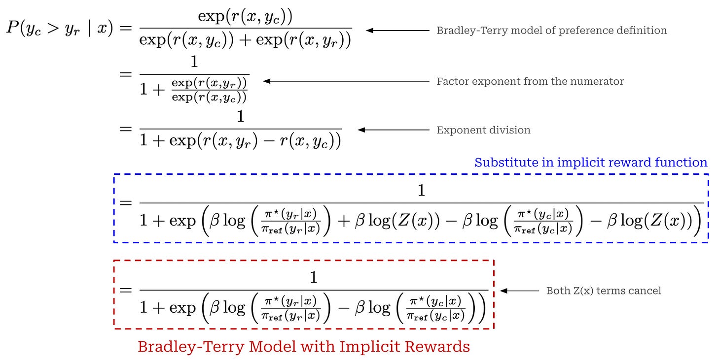 components of the implicit reward function actually cancel out when subtracting the implicit reward for the chosen completion from the implicit reward for the rejected completion.