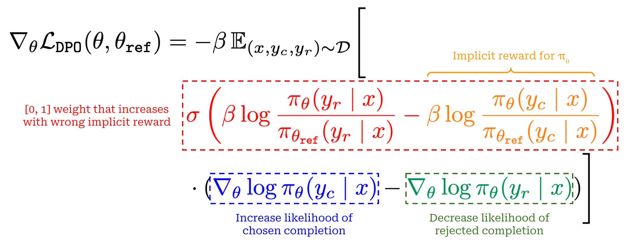 To gain a deeper understanding of DPO and why it works well, we can look at the structure of the gradient for DPO’s loss function; see above10. There are three key terms in this expression, colored in red (with part of the term in orange), blue and green for clarity. The purpose for each of these terms is as follows: