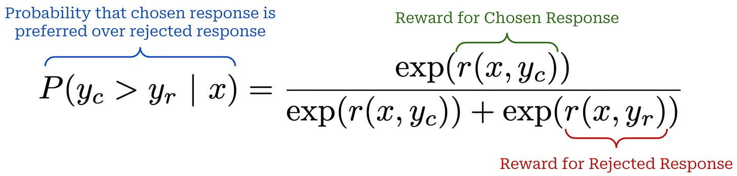 The Bradley-Terry Model of Preference is the most popular statistical model to use for modeling preferences within the LLM domain. At a high-level, Bradley-Terry takes two items (e.g., a chosen and rejected completion) and an associated reward for each of these items as input. Using this information, we can express the probability that one item is preferred over another as shown below. Here, we assume that the items we are comparing are structured as a preference pair.