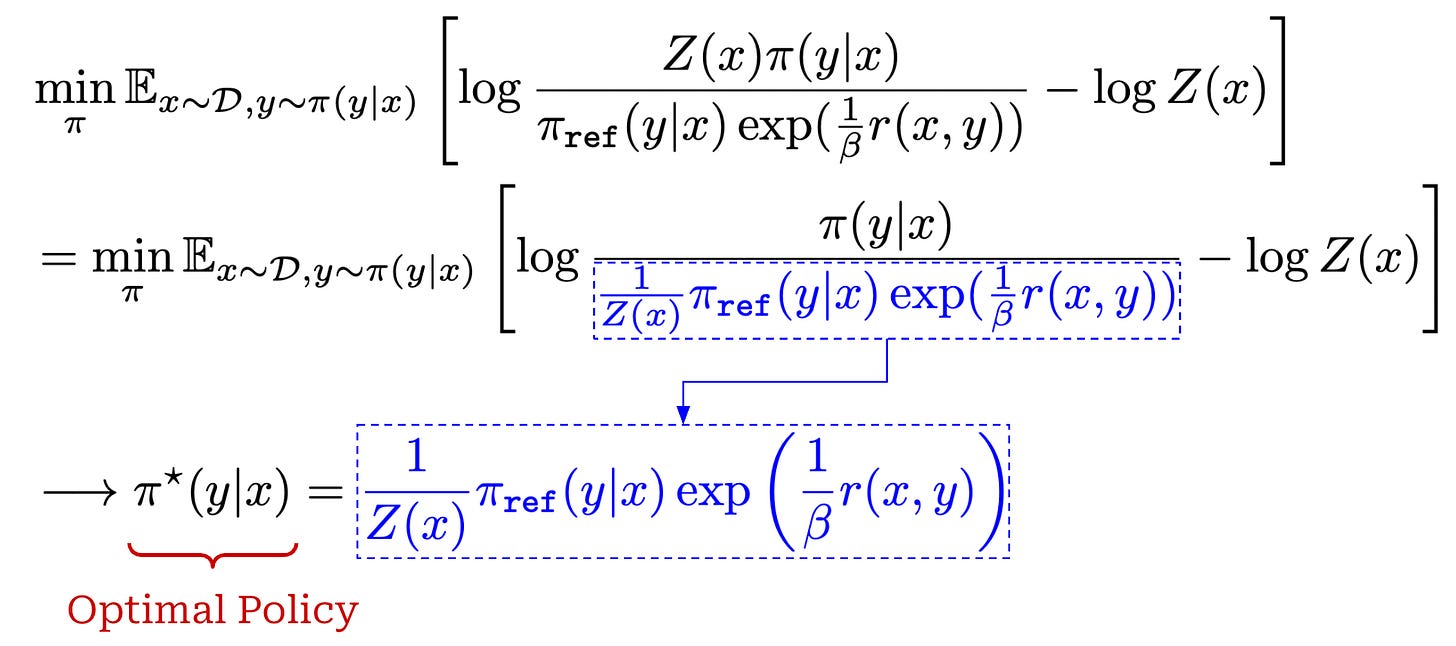 Now that we understand the key ideas behind DPO, we need to understand where DPO comes from and how we know that it is solving the same optimization problem as standard RLHF. To do this, we will rely upon theory, meaning that this section will contain many equations. Although the theory can be difficult to parse, understanding it is beneficial for gaining a fundamental grasp of why DPO works. To make the theory digestible, we will break the derivation down step by step with corresponding explanations for each step.