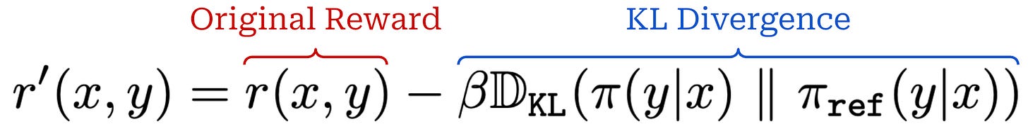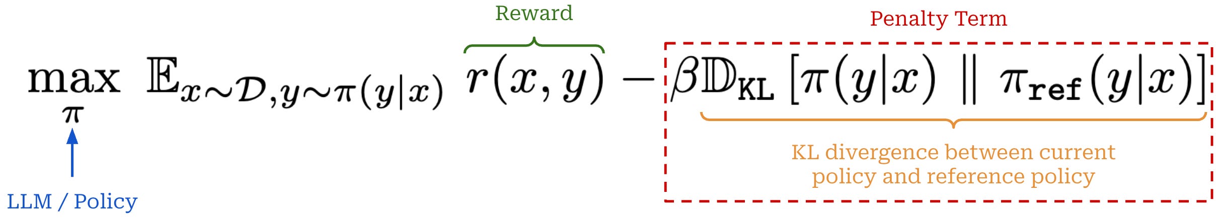 As we can see, we want to maximize rewards while minimizing a penalty term—the KL divergence weighted by β—that is subtracted from these rewards. The goal of the penalty term is to avoid our policy3 drifting too far away from a reference policy during training. Let’s dive deeper to understand exactly what this means.