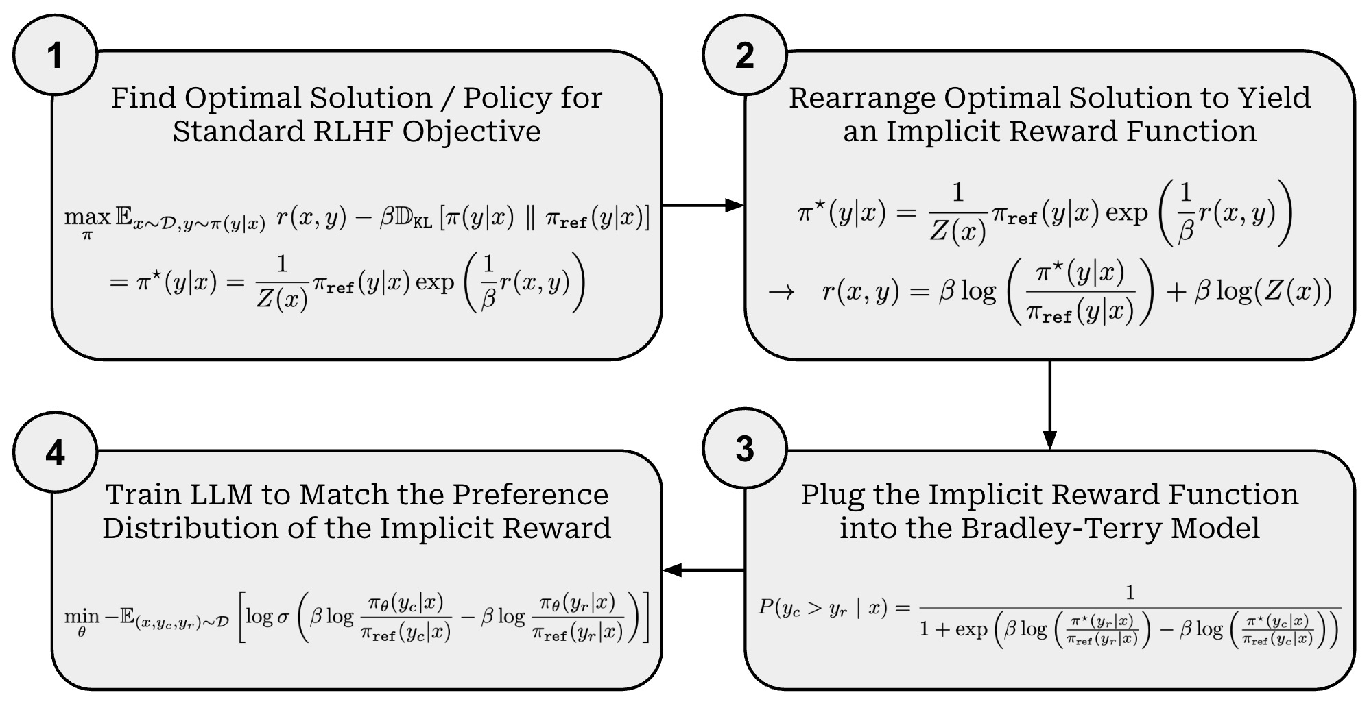 Proof sketch. Beginning with the standard RLHF training objective, we can derive the training loss used in DPO by following four key steps (shown above):