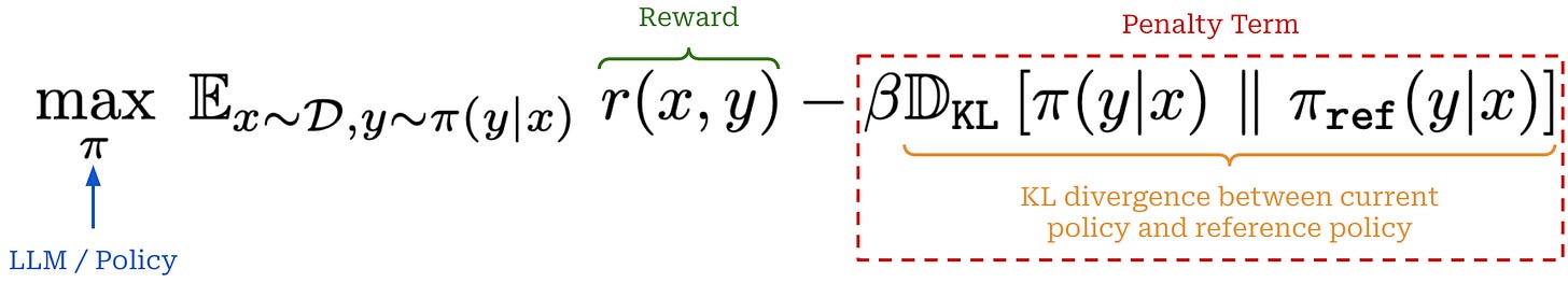 In this equation, we maximize the expected reward received by our LLM’s completions under an additive penalty for the KL divergence between the learned policy and the initial SFT model (or any other reference model)—the KL divergence is included as a penalty term in the loss function. The tradeoff between the reward and KL divergence is controlled by the hyperparameter β.