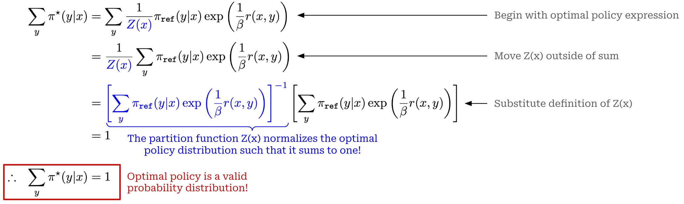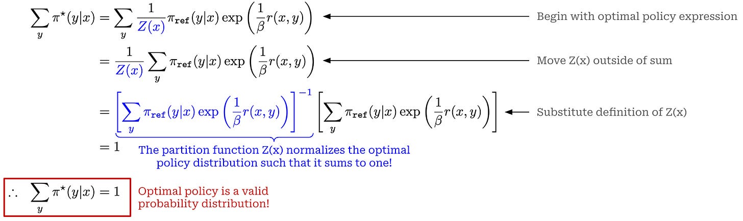 to ensure that the probability distribution we derive—in this case the optimal policy to the RLHF objective—sums to one and, therefore, forms a valid distribution.