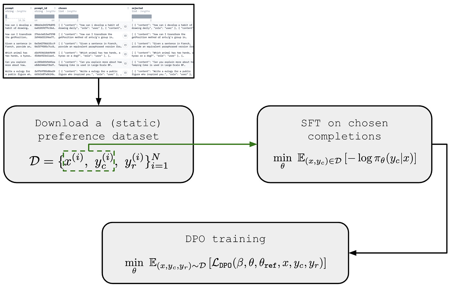 This concept is formalized via the expression above, which defines a preference dataset of prompts with an associated “chosen” and “rejected” response.