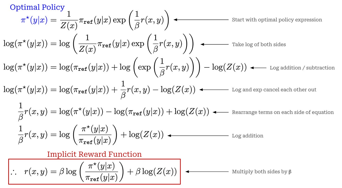 To prove the desired result, we have to draw upon our prior expression that rearranges the optimal RLHF solution to produce an implicit reward. If we plug this implicit reward into the modified reward expression above, we get a reward—which is known to be equivalent to r(x, y)