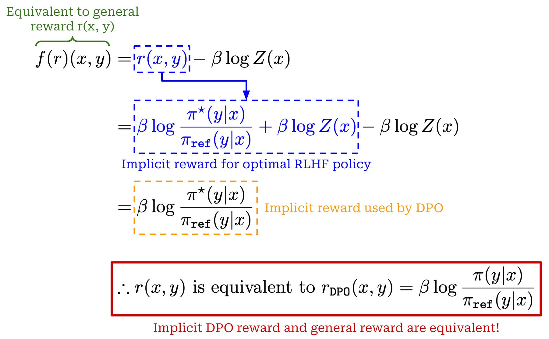 Proving an optimal policy. Given the above results, the last step in this proof is to simply show that the implicit reward function used within DPO is equivalent to the actual reward used within RLHF. If these two reward functions satisfy the equivalence relation, then we know that DPO will yield the same optimal policy as RLHF based on the findings shown above. To prove this final result, we can start by considering an arbitrary reward function r(x, y)