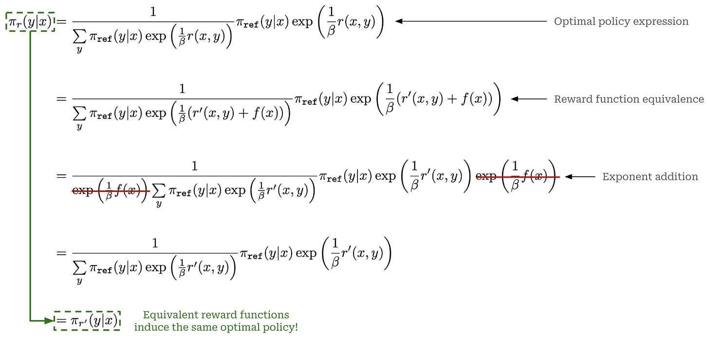 We can also write a similar proof to show that two equivalent reward functions, when plugged into the standard RLHF objective that we explored in the prior section, are guaranteed to yield the same optimal policy; see below.