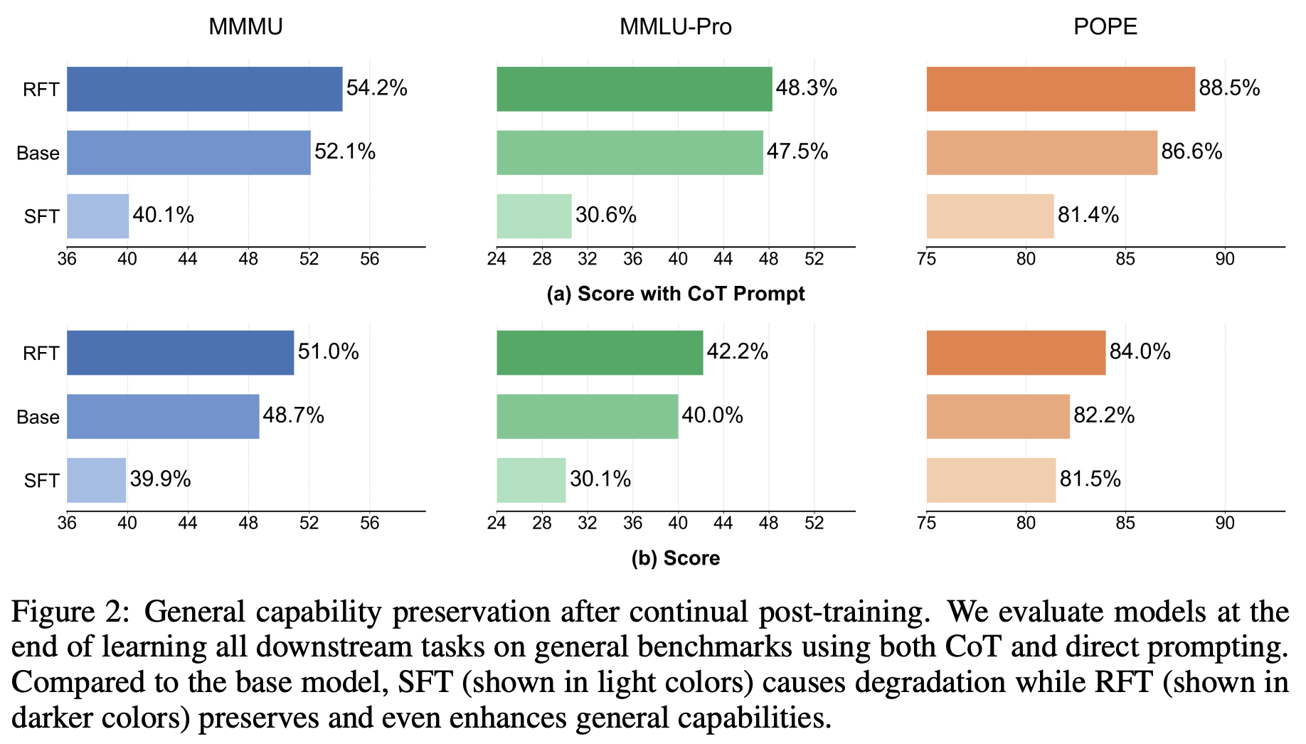 Influence on general capabilities. In the same vein, SFT-based continual post-training also degrades general model capabilities; see below. In contrast, we see in [1] that RL maintains—or even slightly enhances—performance on general benchmarks. For example, models sequentially trained with GRPO improve from an initial accuracy of 52.1% to a final accuracy of 54.2% on MMMU!