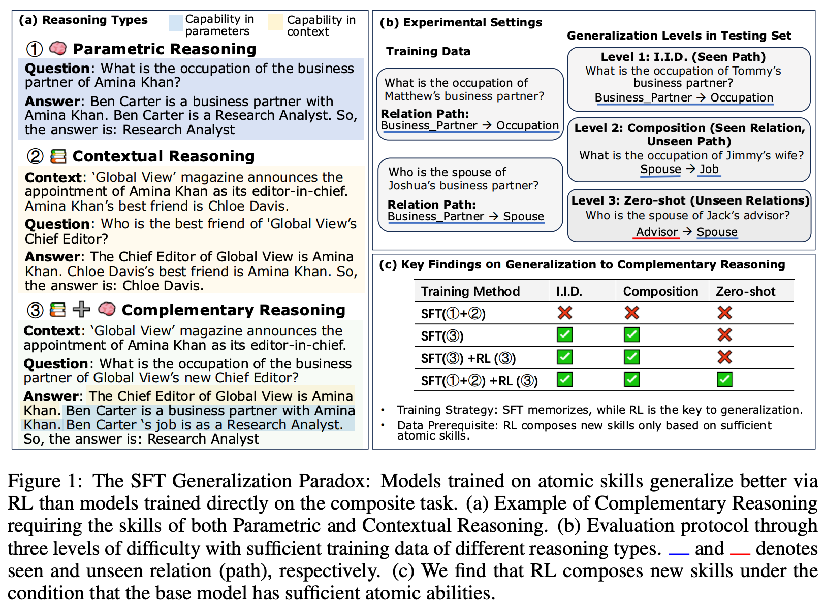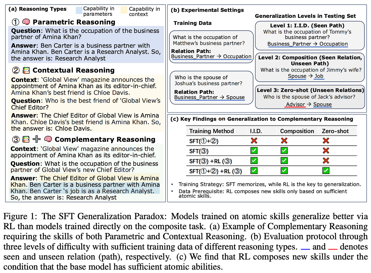 From Atomic to Composite [8] tests the generalization impact of RL training on problems that require complementary reasoning—the ability to integrate external context with the model’s parametric knowledge. To test this style of reasoning, a controlled synthetic dataset is created; see below. The dataset is based on a knowledge graph of human biographies with fixed relationships. Using this graph, we can construct multi-hop questions that test complementary reasoning by design. More specifically, questions are specifically constructed to test three levels of reasoning with increasing complexity (depicted below):