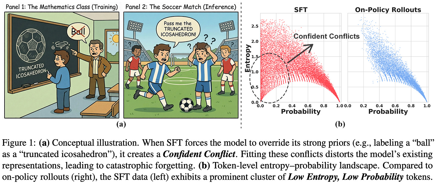 “While RL aligns with the model’s internal belief, SFT forces the model to fit external supervision. This mismatch often manifests as Confident Conflicts—tokens characterized by low probability but low entropy.” - from [6]