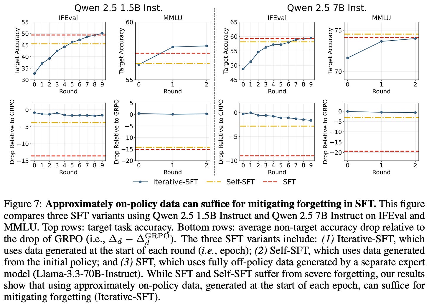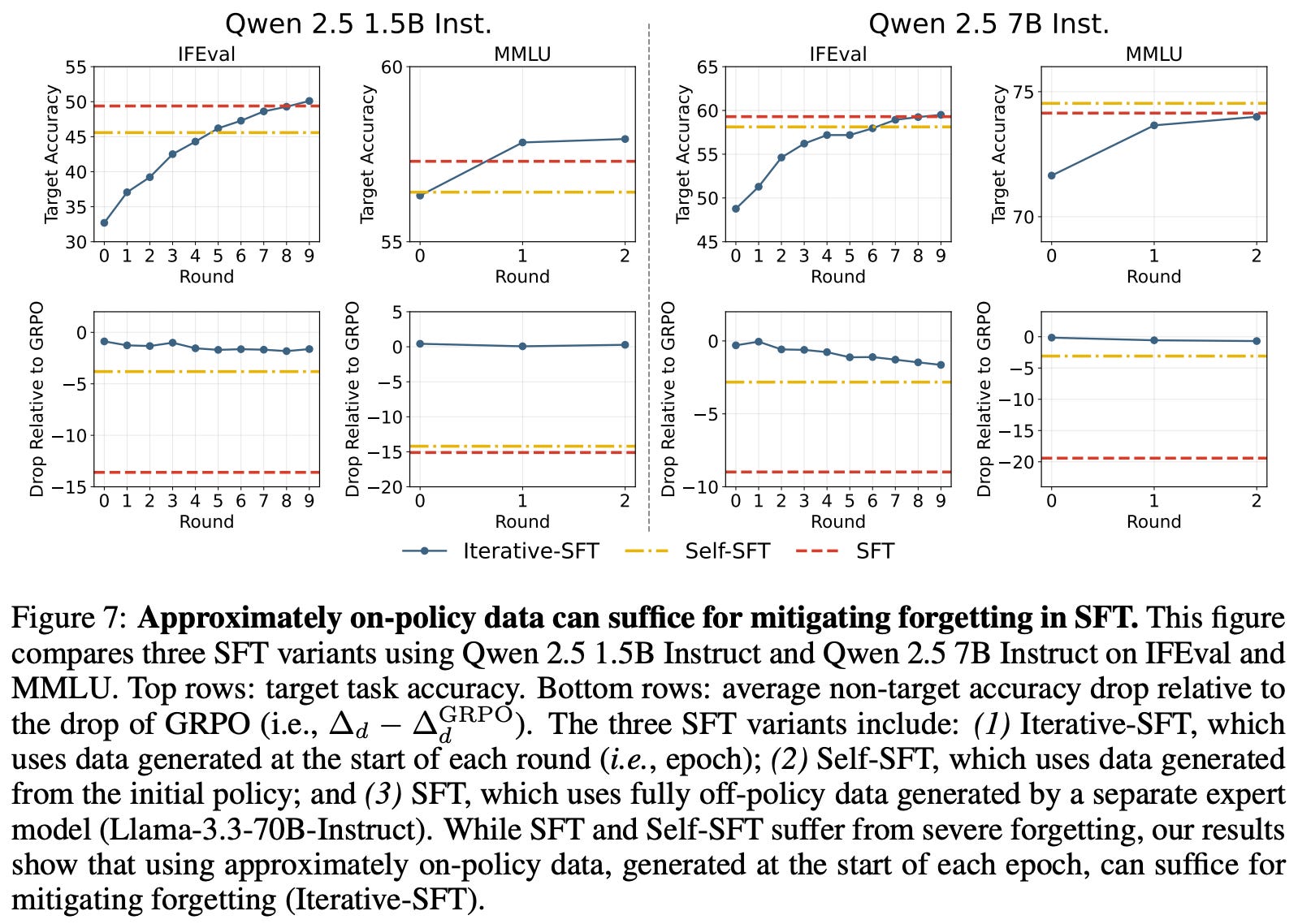 “We find that for SFT, while generating data only from the initial policy is not enough, approximately on-policy data generated at the start of each epoch can suffice for substantially reducing forgetting. This suggests a practical guideline for LM post-training: leveraging on-policy data, potentially sampled asynchronously or at the start of each epoch for improved efficiency, can reduce unintended disruption of the model’s existing capabilities.” - from [2]
