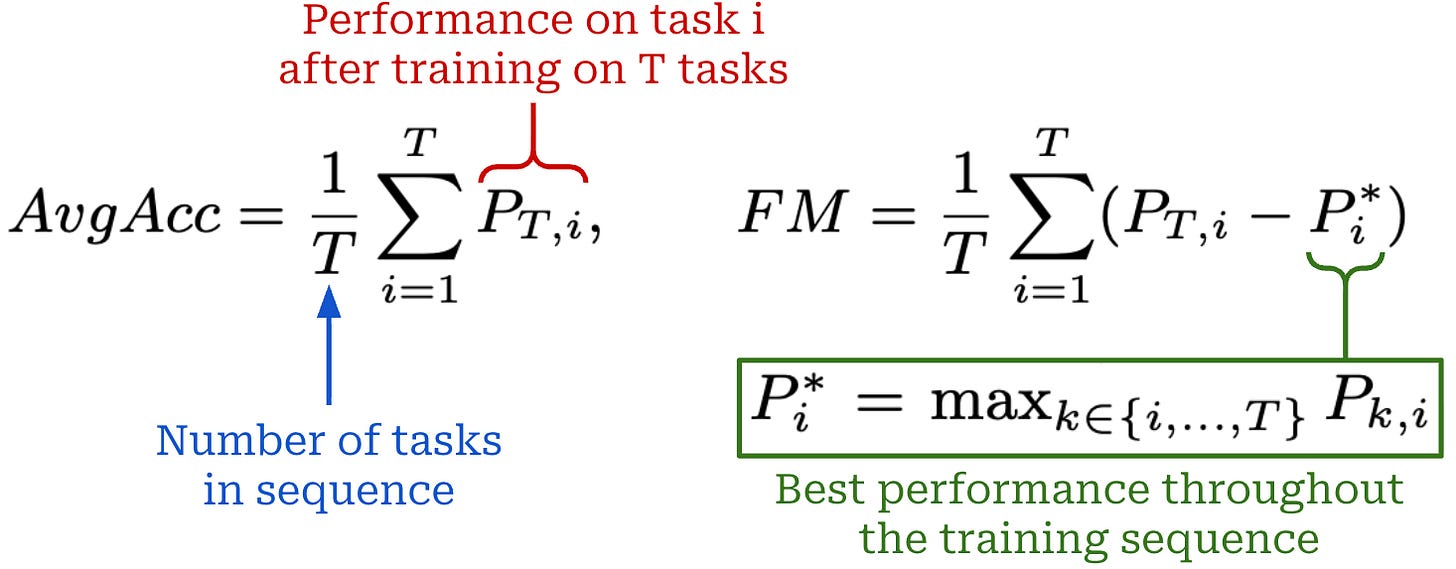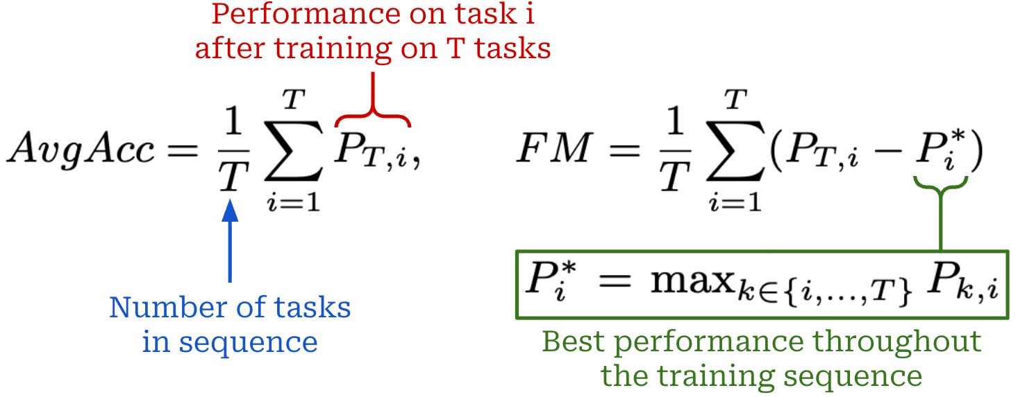 Average accuracy (AvgAcc): the average accuracy of the model across all tasks after training on the final task