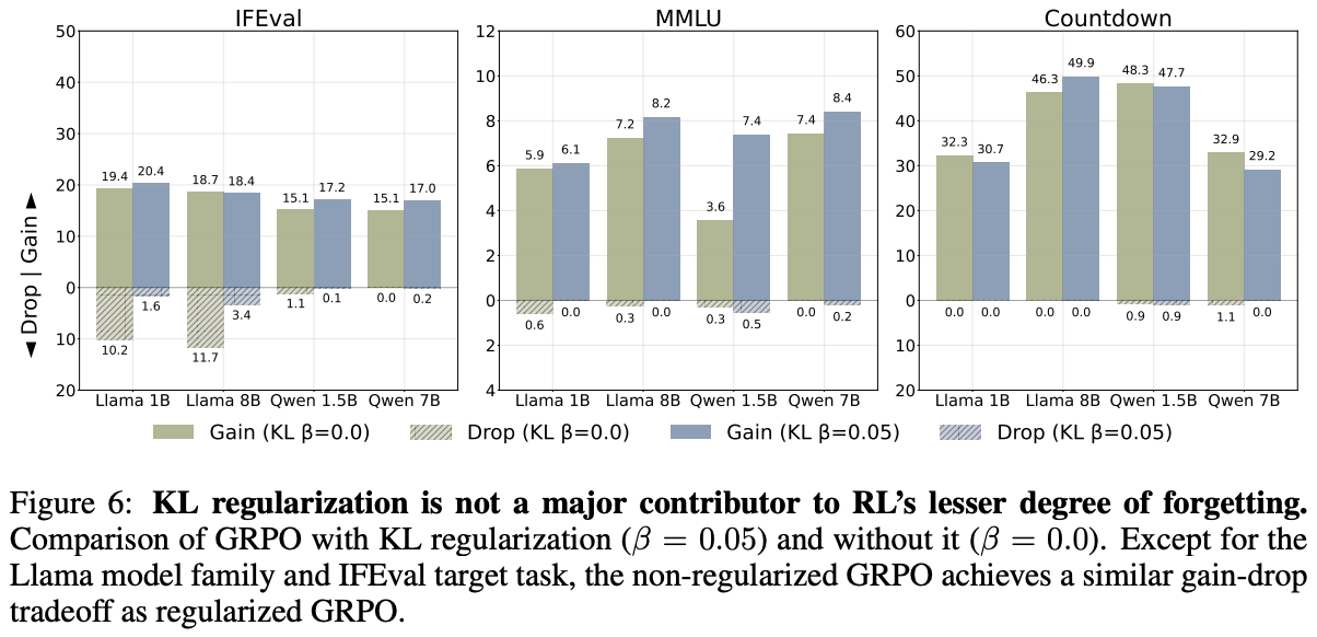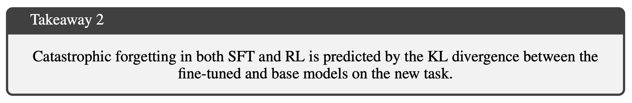 The only quantity that demonstrates a consistent relationship with the amount of catastrophic forgetting is the KL divergence between base and finetuned models over the target dataset; see below. The fact that the rank or sparsity of policy gradient updates is unrelated to forgetting is notable, as prior research [4] has shown that RL works surprisingly well even when using LoRA with a low rank. Such a finding indicates that the updates being produced by RL are potentially sparse or low rank, which could help to reduce forgetting. However, we see in [3] that the story is not this simple. Rather, the benefits of RL stem from an implicit KL regularization—or RL’s Razor—that minimizes distribution shift in training.