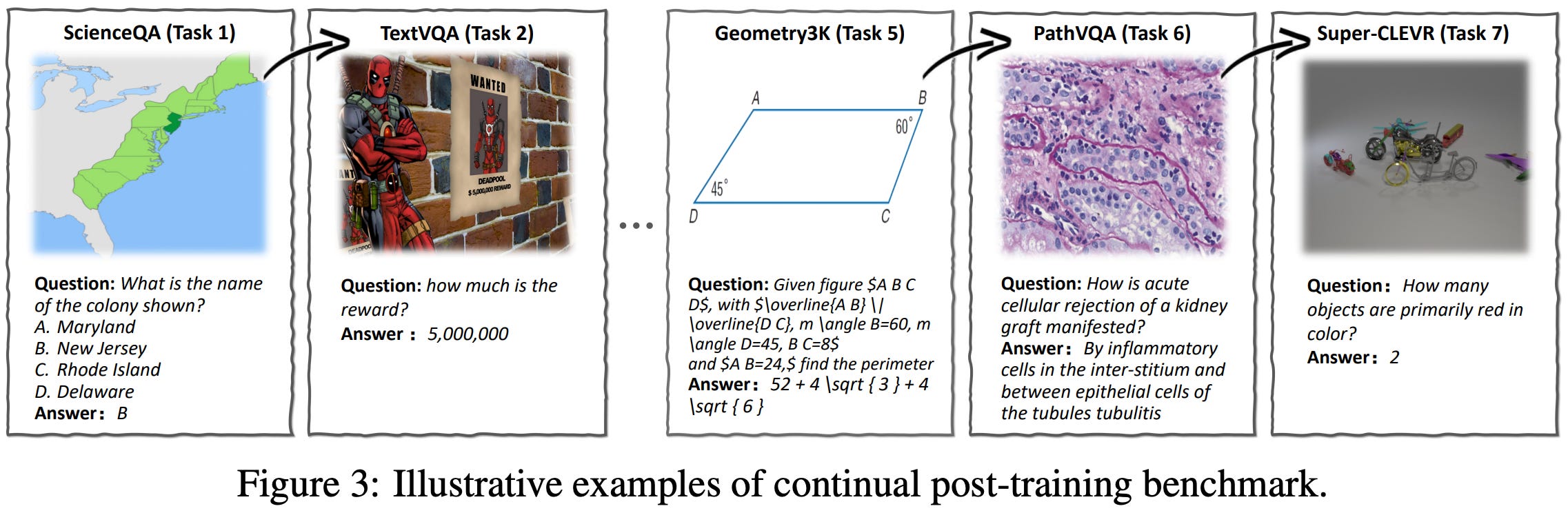 Continual post-training. In the real world, continual learning is messy—the LLM will be constantly exposed to new data from various sources—but a more organized proxy setup is needed for research. A common way to simulate continual learning is via a sequential learning (or batch-incremental) setup, where the LLM is sequentially exposed to an ordered group of datasets. In [1], authors choose seven datasets that cover a wide scope of multi-modal (vision) use cases: ScienceQA, TextVQA, VizWiz, Geometry3K, GQA, PathVQA, and Super-CLEVR.