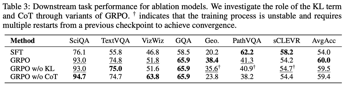 As an interesting side note, authors in [7] also find that RL benefits the model’s underlying perception capabilities. Namely, the model actually improves in its ability to identify key vision features during training, indicating that RL is not just learning reasoning patterns but also improving fundamental abilities (i.e., perception).