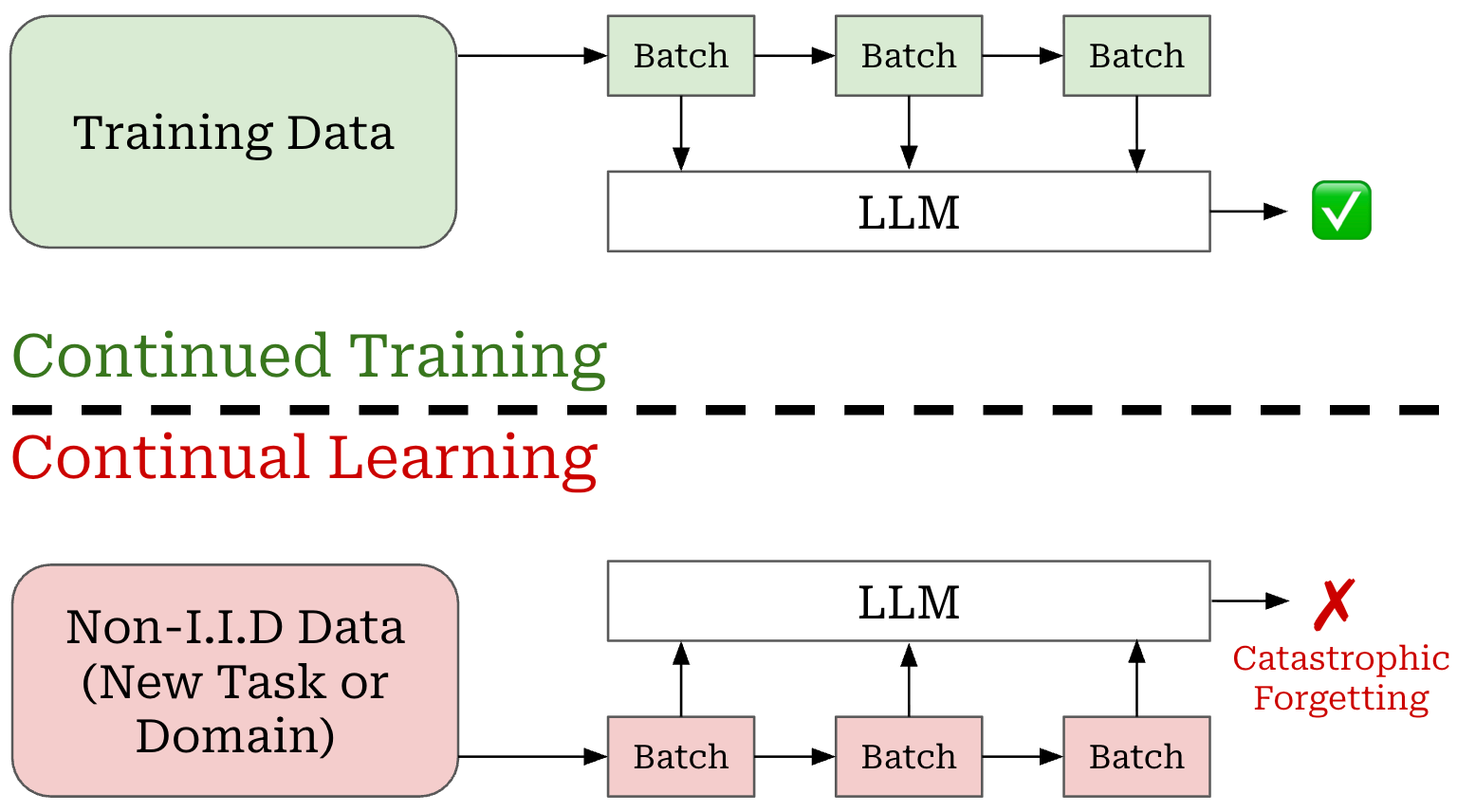 Non-IID data. First, we must consider the kind of data being exposed to our model. If the incremental data over which the model is trained is sampled from the model’s training distribution, then training on this data is unlikely to cause forgetting. This setup resembles a continued training approach, which is used frequently for LLM pre and post-training. However, if the incremental data is non-IID—or sampled from a distribution that is new or different from the training data distribution—then catastrophic forgetting becomes very likely; see below.