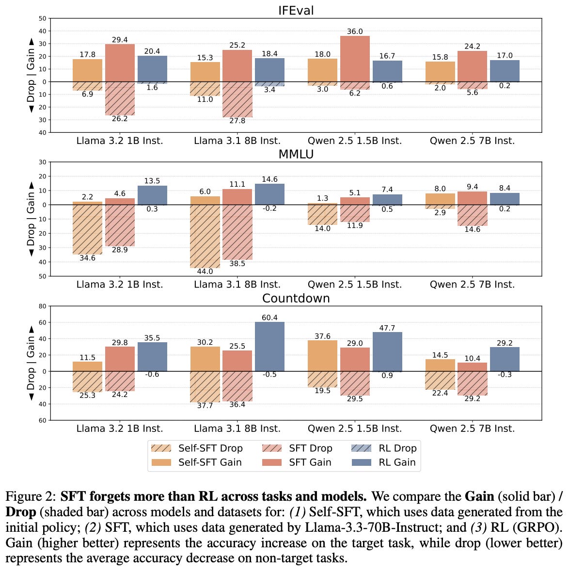 RL forgets less (again). Experiments are performed in [2] using Qwen-2.5 and Llama-3 models with up to 8B parameters. As shown above, higher levels of forgetting—as measured via the average accuracy drop across non-target tasks—are observed with SFT compared to RL. In fact, Qwen-2.5 models see <1% average accuracy drop across all tasks and model scales for RL training, whereas the average accuracy drop with SFT reaches nearly 30% in some cases.