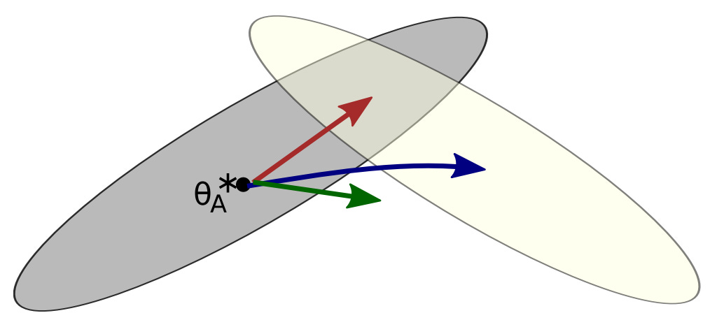 The three arrows in the figure depict three possible solutions that can emerge when trying to solve this continual learning problem. The red arrow depicts a solution that performs well on both tasks, while the blue and green arrows perform well on only the new task or neither task, respectively. Put simply, the goal of continual learning is to develop techniques that reliably follow the red arrow. More specifically, an effective continual learning system should both: