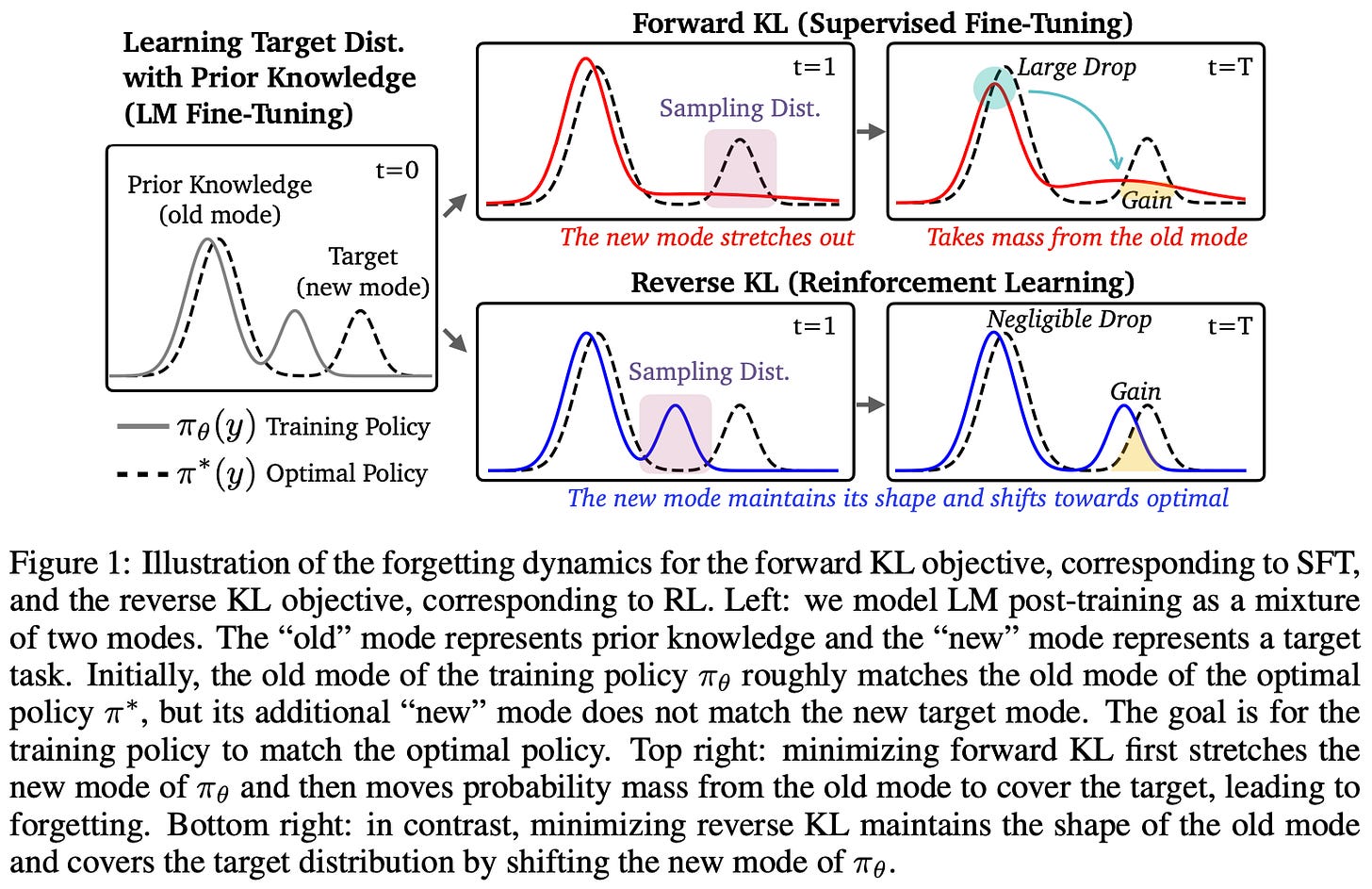 In the standard LLM post-training setup, the mode-seeking behavior of RL is more robust to catastrophic forgetting. To explain this phenomenon, authors in [2] construct a simplified setting shown above, which illustrates the dependence of forgetting on the modality of the underlying target distribution. If our target distribution is multi-modal, which is likely to be true for an LLM, then the mode-seeking nature of RL actually leads to less forgetting relative to a mode-covering objective like SFT. The simplified distribution that is constructed in [2] has two modalities corresponding to old and new knowledge. For such a distribution, the forward KL objective yields noticeable forgetting while minimizing the reverse KL allows both modes of the target distribution to be properly captured.