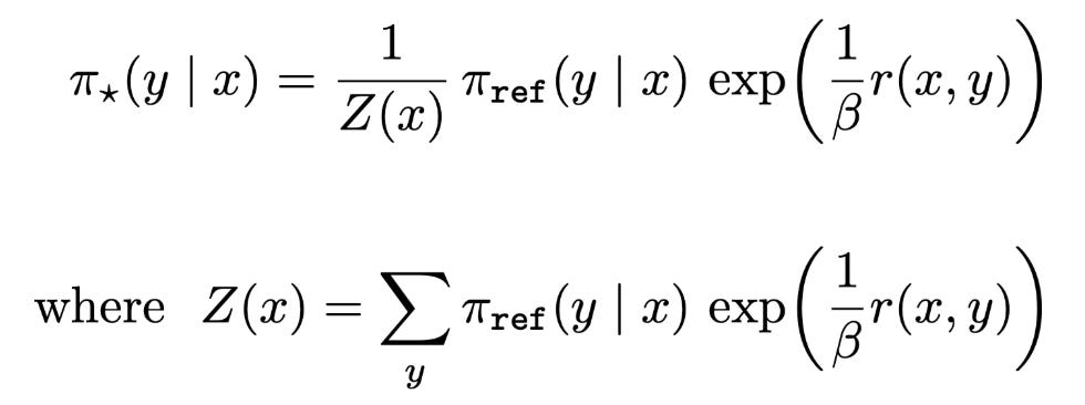 RL ≈ reverse KL. As mentioned previously, RL tries to maximize the reward of on-policy completions while minimizing KL divergence with respect to a reference policy. We can actually derive a closed-form expression for the optimal solution to the RL objective. The expression for the optimal policy is shown below, where Z(x) denotes the partition function. Notably, this optimal policy expression is also the first part of deriving the training loss for DPO!