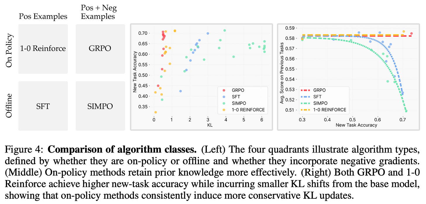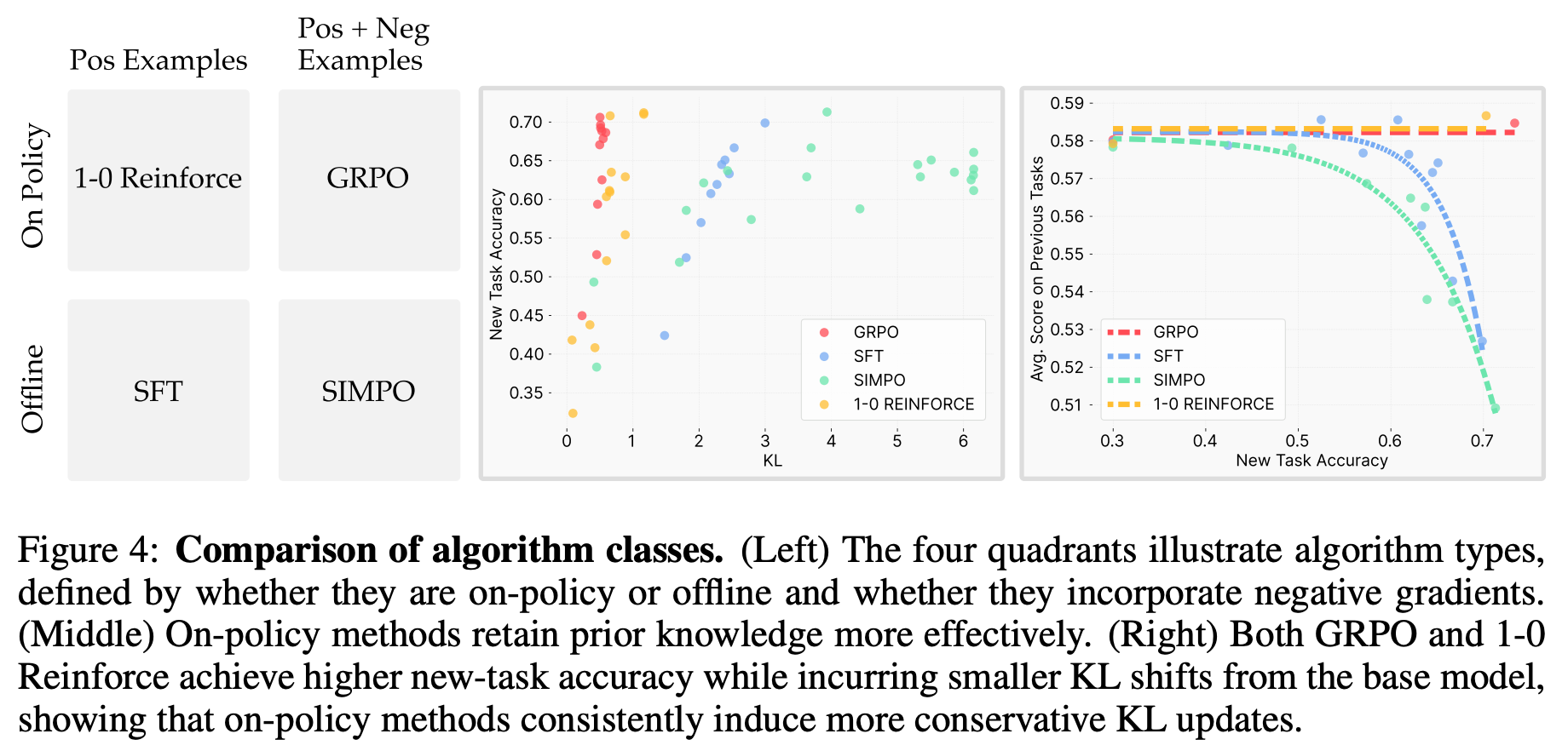 As we can see in the left half of the above figure, these experiments ablate the use of negative examples and on-policy data within the training setup. Interestingly, the 0-1 REINFORCE algorithm performs similarly to GRPO, while results with SimPO resemble those of SFT. Such results indicate that the use of on-policy data is the key contributor to RL’s lack of forgetting. We also see above that the use of on-policy data leads to minimal KL divergence between the base and finetuned models over the target distribution. Such results indicate that the implicit bias of RL towards low KL solutions stems from the online nature of training. This empirical observation is also justified by further theoretical analysis in [3].