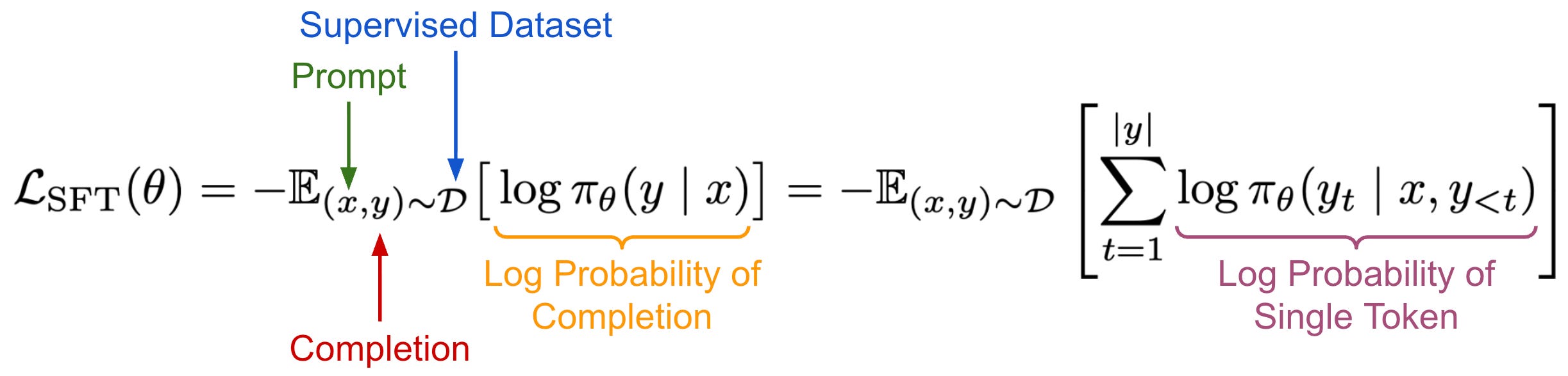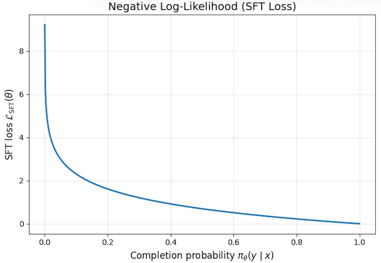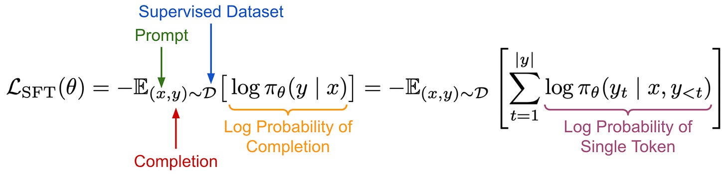 Training objectives. In SFT, we have a fixed dataset of supervised examples over which we are training our LLM. The training objective aims to minimize the model’s negative log-likelihood over this dataset, as shown below.