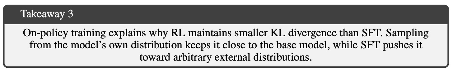 “RL performs well because its on-policy updates bias the solution toward low-KL regions, but when SFT is explicitly guided to the KL-minimal distribution, it can surpass RL.” - from [3]