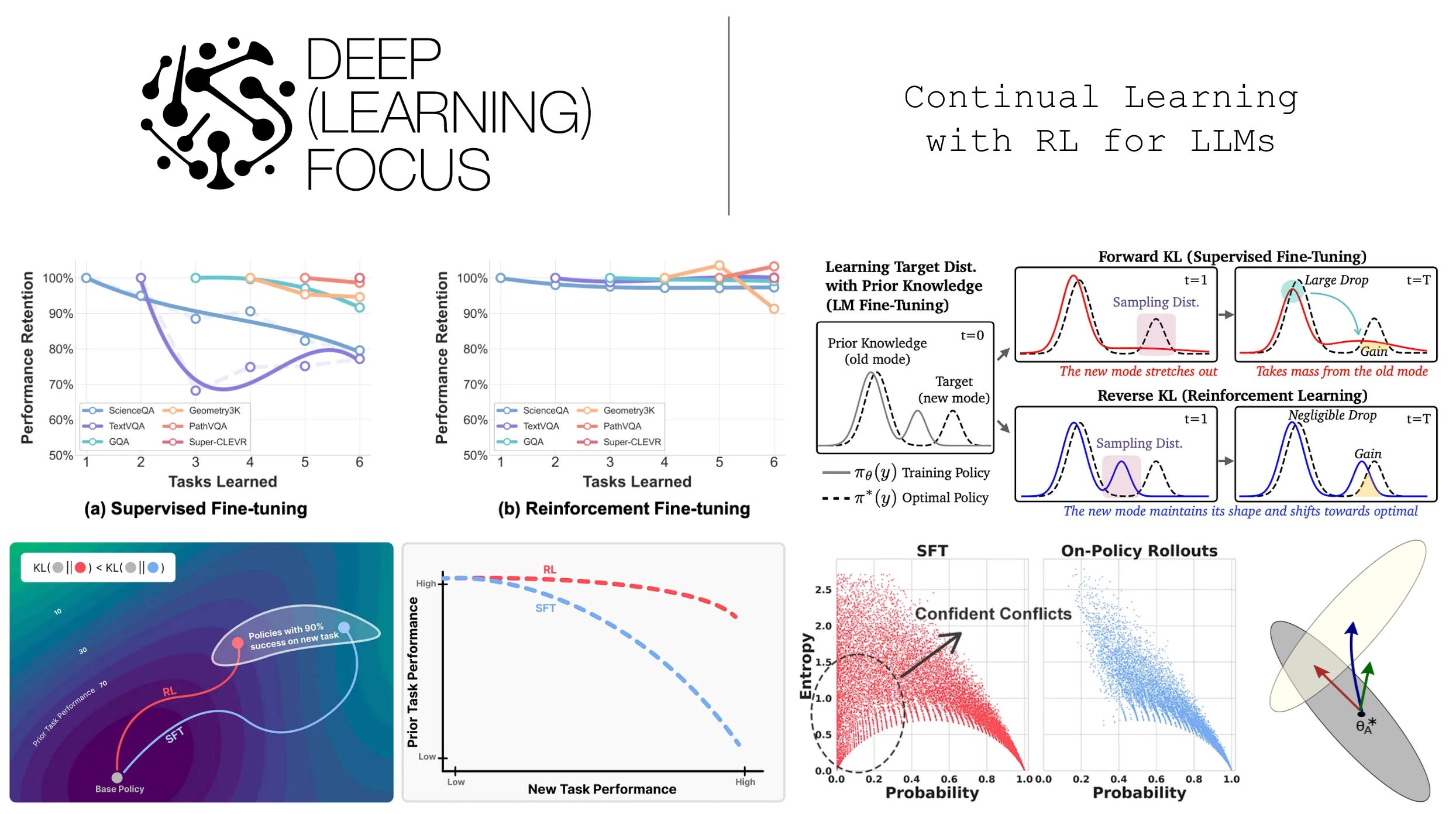 We will now take a look at several papers that study the topic of continual learning in the context of LLMs. Instead of focusing on continual learning techniques, however, these papers adopt standard LLM training methodologies—supervised finetuning (SFT) and reinforcement learning (RL) in particular—and analyze their natural ability to avoid catastrophic forgetting. Although SFT tends to not perform well for continual learning, RL is found to be shockingly robust to forgetting, even without employing explicit continual learning techniques (e.g., replay buffers or regularization). Given the current popularity and impact of RL in training frontier models, this inherent ability to handle continual learning makes RL an important tool for the creation of generally intelligent systems.