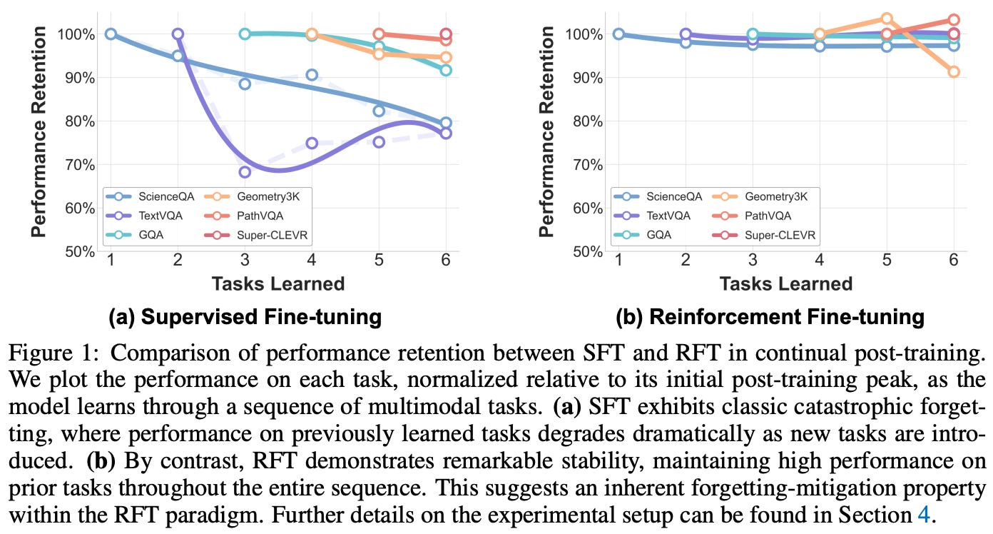 SFT versus RL. Continual post-training experiments are performed in [1] using the Qwen-2.5-VL-7B-Instruct model, which is sequentially trained on data from each of the seven benchmarks. Notably, no replay buffer or data from prior tasks is used when training on new tasks, so the model’s ability to avoid forgetting is entirely dependent upon mechanics of the learning algorithm. As mentioned before, two types of learning algorithms are used: