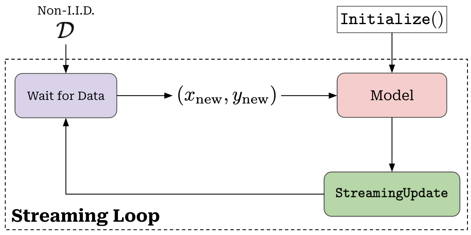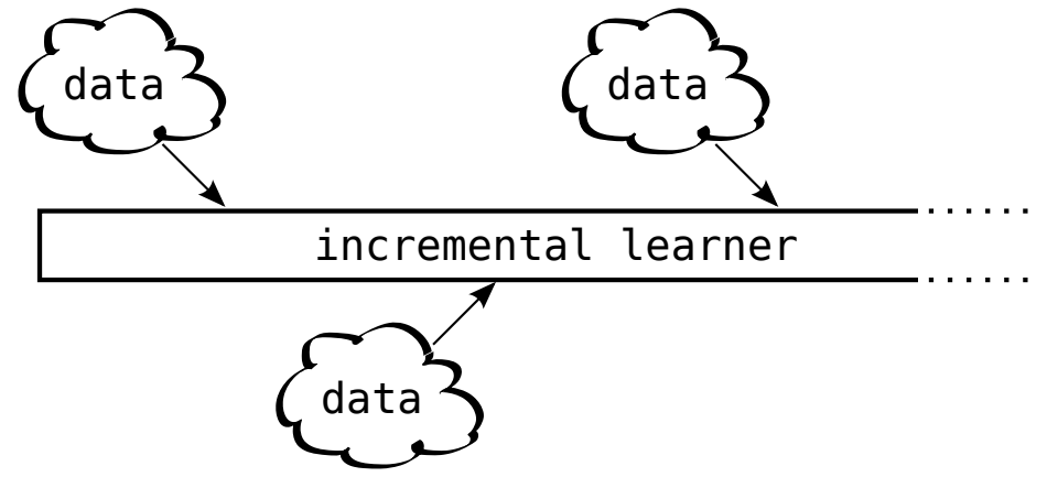 The batch-incremental framework may not always be realistic, as our model may receive data in much smaller increments. For these cases, a streaming learning setup may be more appropriate. Streaming learning uses brief, online updates (i.e., one or a few forward and backward passes) for each piece of incoming data, forcing learning of new data to happen in real-time; see below.