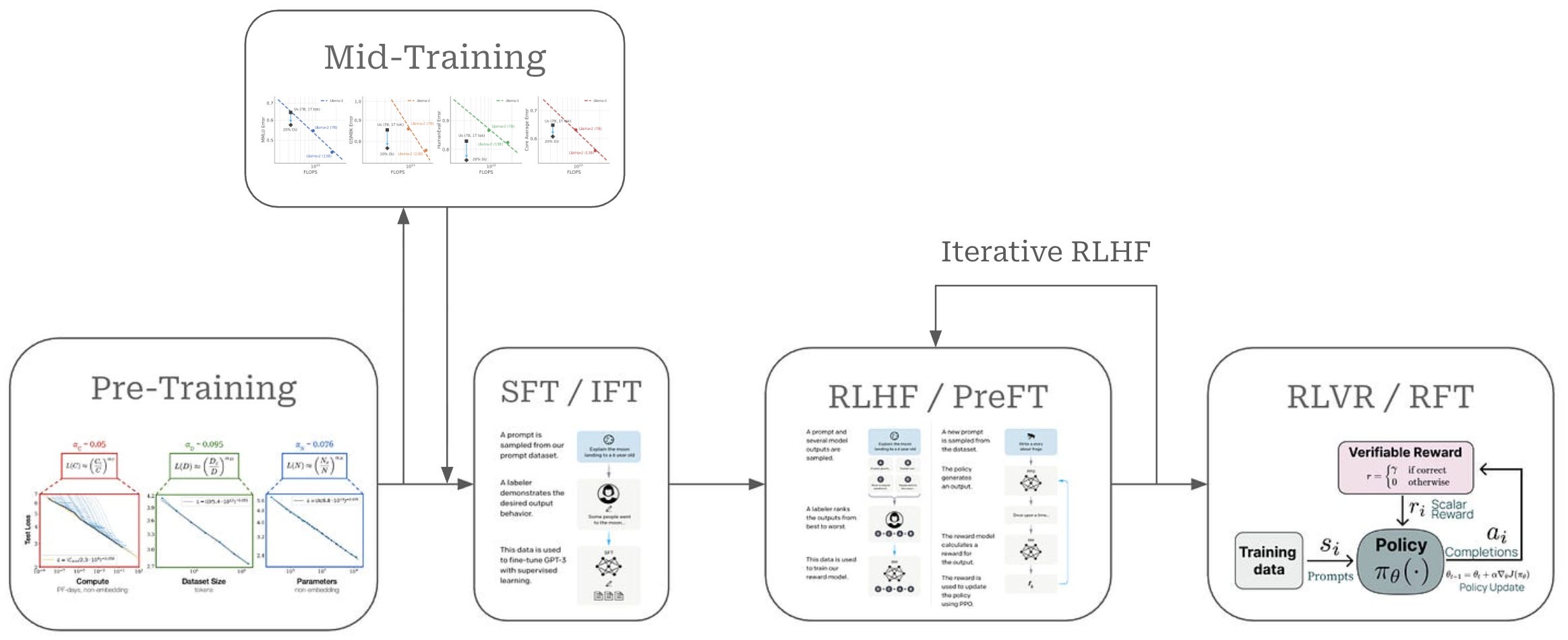 SFT Memorizes, RL Generalizes [7] performs a comparative post-training analysis between SFT and RL on both language-only and vision-language tasks. The main results of this analysis are depicted above, where we see that: