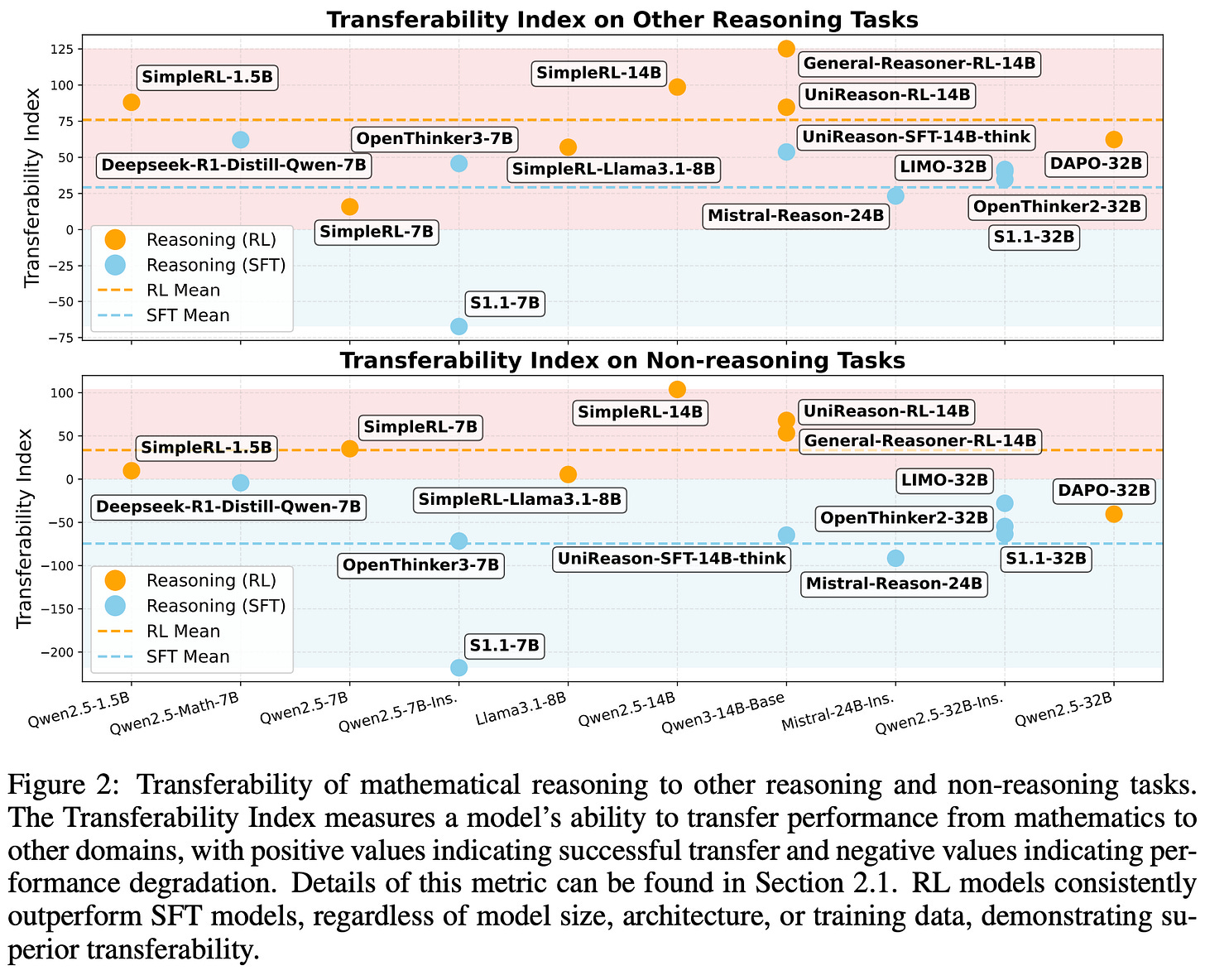 As shown in the above plot, SFT-trained models tend to have poor transferability to non-reasoning tasks, while models trained with RL generalize across both reasoning and non-reasoning tasks—RL models generalize well beyond math and naturally avoid catastrophic forgetting. Similar trends are observed when analyzing the transferability of other open SFT or reasoning models across reasoning and non-reasoning benchmarks; see below. Further analysis in [9] reveals that on-policy data—as we might expect from [2, 3]—and the presence of a negative gradient in the RL objective are key contributors to favorable generalization properties.