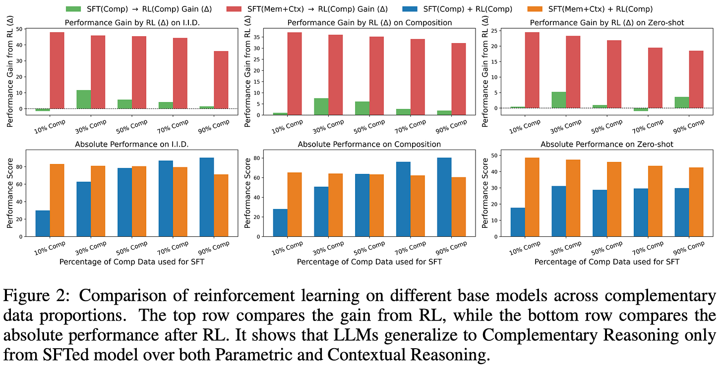 As we can see, this analysis shows us that RL is capable of synthesizing multiple atomic reasoning capabilities into higher-level (composite) reasoning patterns. However, this is only possible when the model is trained with SFT prior to RL. In contrast, pure SFT training yields high in-domain performance and poor out-of-domain generalization, which reflects findings in prior work. In other words, SFT tends to memorize reasoning patterns rather than learn them. When a model is first trained via SFT to acquire primitive reasoning capabilities, then RL serves as a “synthesizer” through which the model learns how to properly combine these capabilities for solving complex, compositional reasoning problems.