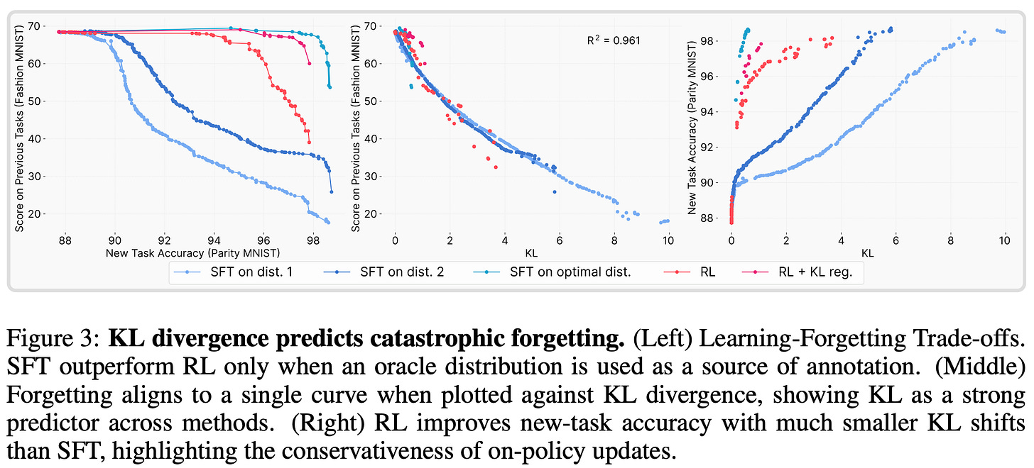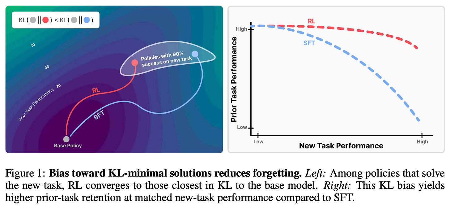 “RL’s Razor: among the many high-reward solutions for a new task, on-policy methods such as RL are inherently biased toward solutions that remain closer to the original policy in KL divergence… the KL divergence between the fine-tuned model and the base model, measured on the new task, reliably predicts… forgetting.” - from [3]
