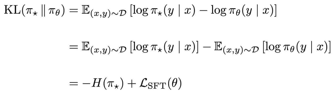 SFT ≈ forward KL. Using these concepts, we can show that the training objective used by SFT is equal to the forward KL divergence up to a constant. Let’s call the optimal (or target) distribution for our dataset π_*. We can show the following for the relationship between this objective and the forward KL divergence, where H(π_*) denotes the entropy3 of the optimal distribution over the SFT dataset.