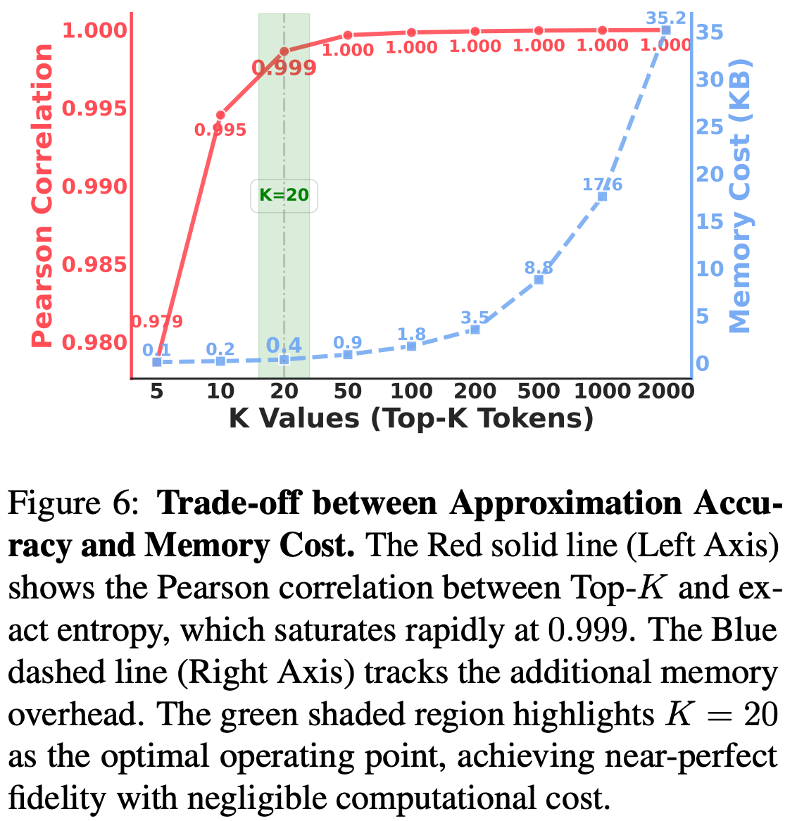 To improve the efficiency of EAFT, authors in [6] only compute entropy over the Top-K (where K = 20) tokens in the distribution. As shown in the figure below, this setting balances the tradeoff between compute and memory overhead and ensures that added computational overhead relative to vanilla SFT is minimal.
