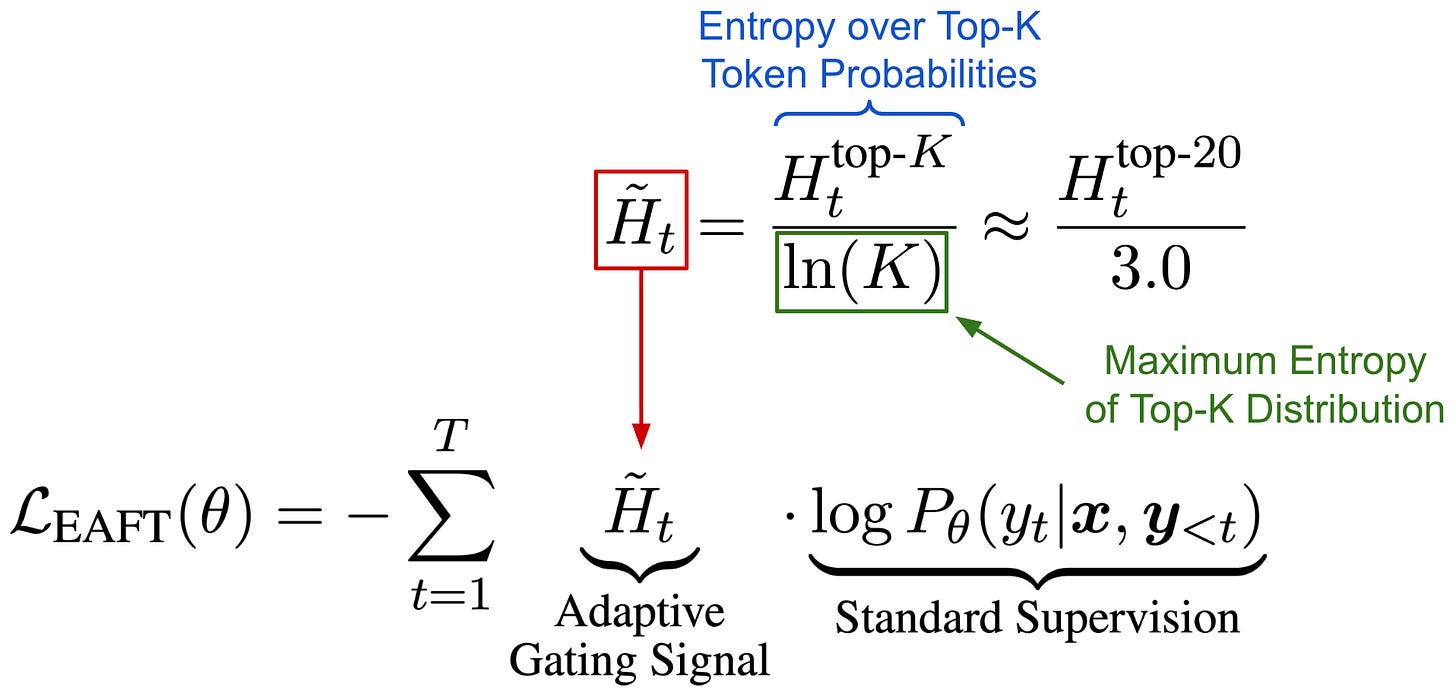 Extending this idea, a novel training algorithm, called Entropy Adaptive Finetuning (EAFT), is proposed in [6] that scales the token-level cross-entropy loss by a dynamic entropy factor. The new loss formulation is outlined below, which multiplies the supervised loss by the token’s normalized entropy7. By using this token-level entropy scaling factor, we can effectively mask the loss of low entropy tokens that lead to destructive gradient updates while maintaining the full update for high entropy tokens that are beneficial for exploration.