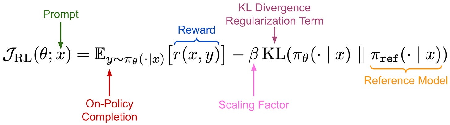In contrast, RL uses the objective shown below, which focuses on maximizing the reward—such as a binary correctness signal in RLVR—of on-policy completions sampled for prompts taken from a fixed dataset. Optionally, we can include a KL divergence regularization term that penalizes the model for producing an output distribution that differs significantly from some reference model2.