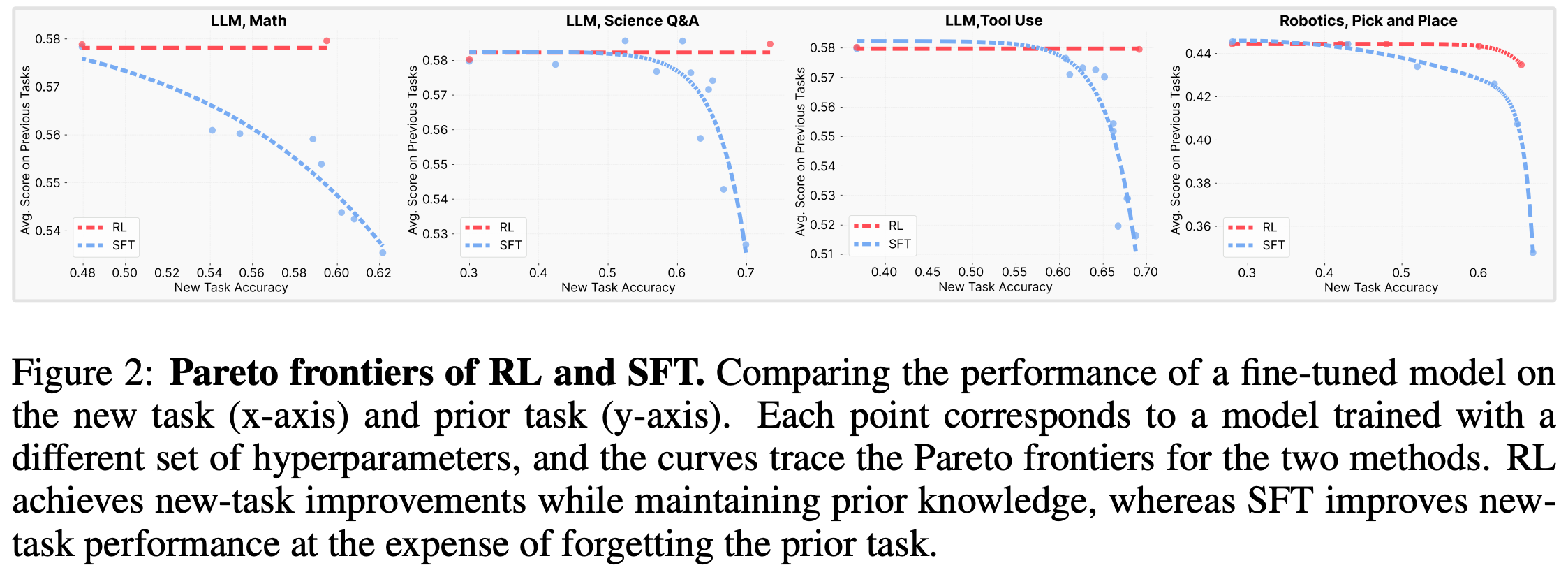 Despite the ability of RL to avoid catastrophic forgetting, the results with SFT are not actually bad—there is just a clear domain tradeoff. We can achieve performance improvements in the target domain via RL training, but models trained via SFT actually perform better. Unfortunately, the superior performance of SFT in the target domain comes at the cost of degraded performance on non-target tasks. For this reason, the comparison is not as simple as RL > SFT. Rather, RL and SFT lie at different points on the Pareto frontier of target and non-target task accuracy—better performance in one domain comes at the expense of the other.