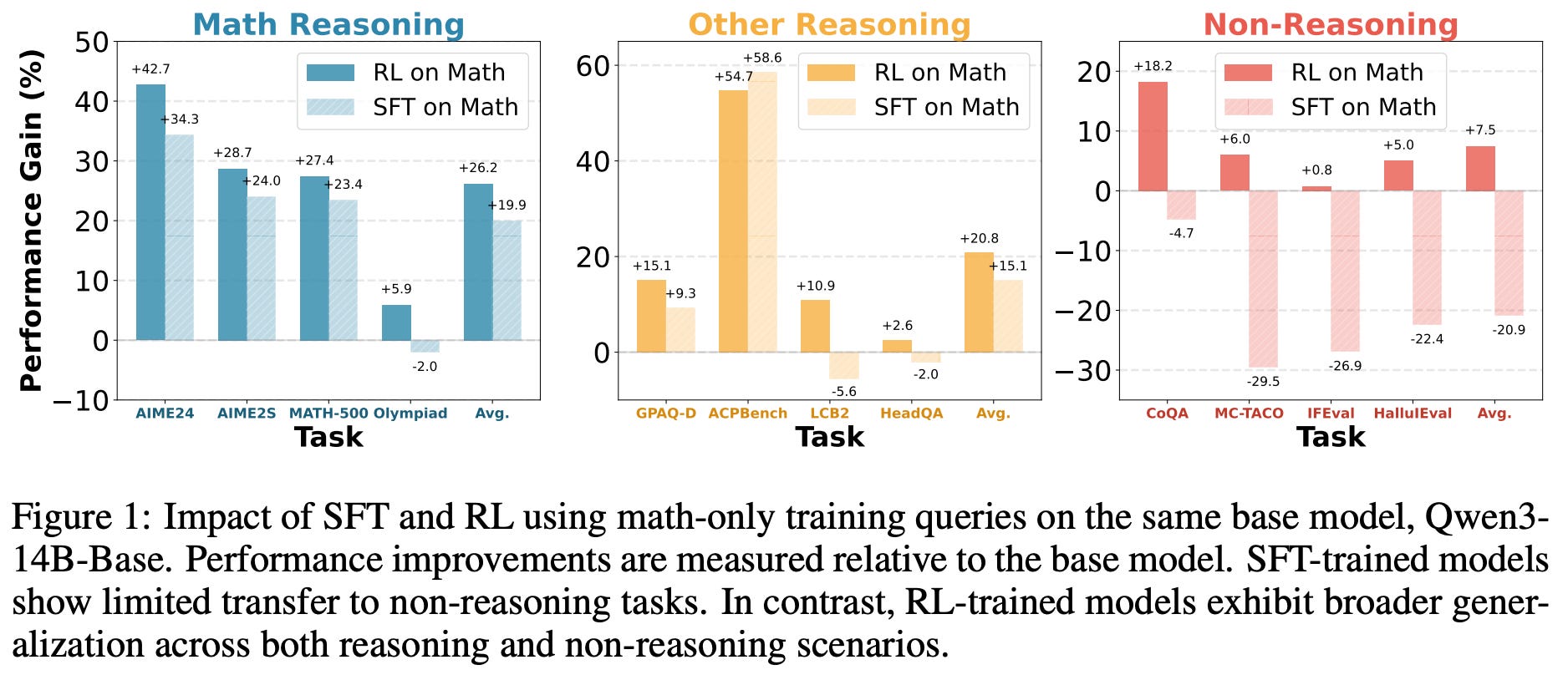 So far, we have focused on retaining old skills while learning new ones. A closely related question is whether the same mechanisms that reduce forgetting also improve transfer and out-of-distribution generalization. The fact that RL performs well in a continual learning setting has important implications for its generalization properties. Put simply, RL training tends to benefit more than just the target domain. As we will see in the next few papers, there are many examples of RL training yielding cross-domain performance benefits or improving the generalization of an LLM to some other task. Much of this analysis is similar in nature to what we have seen for continual learning, but the emphasis shifts from remembering prior tasks to generalizing beyond the training distribution.