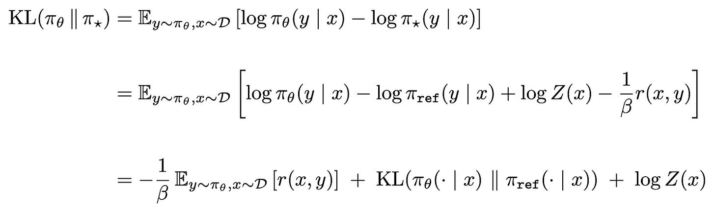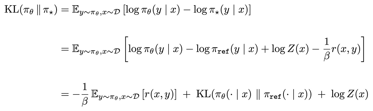 As we can see, the first line of this equation computes the reverse KL divergence relative to the KL divergence used in our derivation for the SFT objective. In the final line, we have the negative of our RL objective (plus a scaling factor of 1/β and an additional constant). Therefore, minimizing this reverse KL divergence objective would be the same as maximizing the RL training objective.